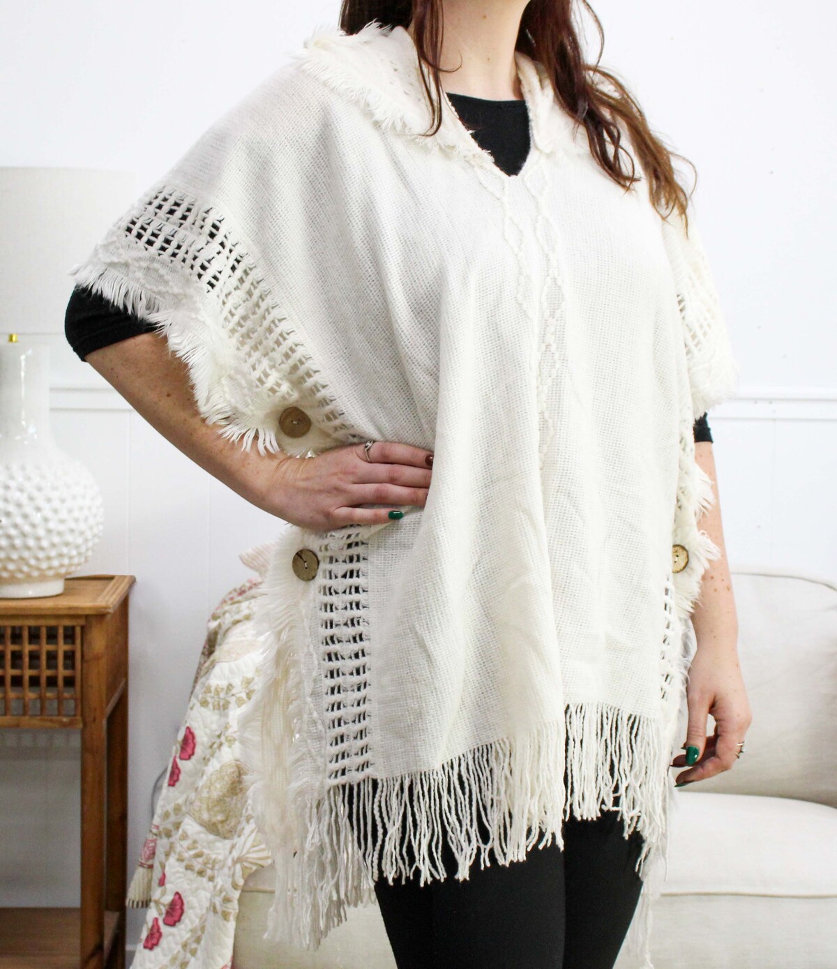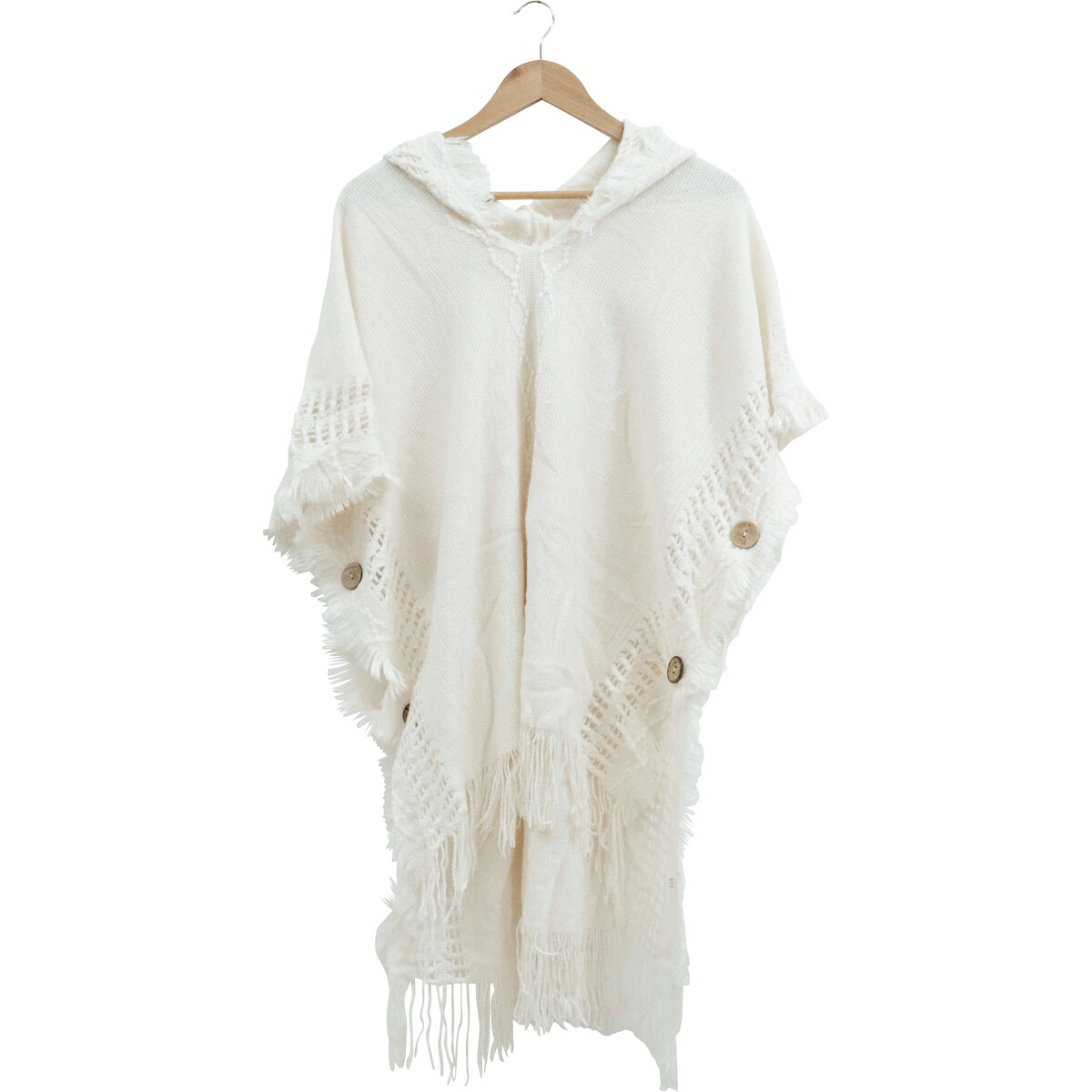 Every once in a while, we come across a piece that just makes us stop for a moment. This Knitted Poncho Sienna Ivory is one of those. The super soft polyester blend has a surprisingly nice weight and the ivory shade feels instantly calming - even if you’re just looking at it draped on a lounge or displayed on its hanger. We find there’s something really soothing about the way the weave falls, too. A wide open knit detail on both sides and oversized wooden buttons add that little bit of country cosiness without actually feeling old-fashioned. It’s something different for sure. This is ideal for shops specialising in home comforts, stylish gifts, or slow living - even those with a broad lifestyle selection might have a lot of luck here. It’ll speak to customers who value classic neutrals or boho vintage styles, right through to those who love romantic, elevated basics with some clever subtlety. We think it’d look beautiful with autumn or winter giftware as a statement layer, but this is one of those great neutrals that will hold its own any time of year. And there’s an extra plus: it has that rare ability to appeal to anyone from college students to mums to older women looking for simple comfort without fuss. This poncho sits comfortably on most body types thanks to an easy shape and thoughtful size inclusivity (one size fits most). The model shown is 175cm tall and usually wears a size 12, which gives a good idea of how easy and flowing this style is in real life. The hood sits in a subtle way so it’s not all dramatic pointy edges like so many other ponchos out there. The fringed trim adds another layer of soft edge detailing. It’ll sit well draped over chairs and beds or layered up with other linen throws as part of display setups - especially among modern bohemian throws and textured scatter cushions. It comes in neutral packaging and we suggest keeping care instructions displayed nearby for your customers (Machine wash cold water only on gentle cycle. Do not bleach or tumble dry).