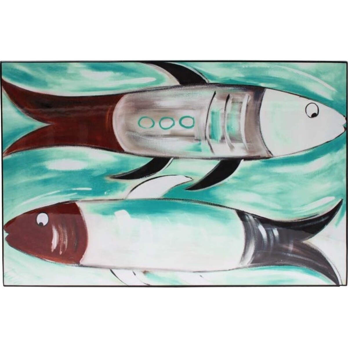 The two fish, depicted in opposite shades of blue and black, swim past each other in a simple but profound artistic style. The whole image taken together thus creates a soothing environment that anyone and everyone can relax in - perfect for the bedroom or the living room.
