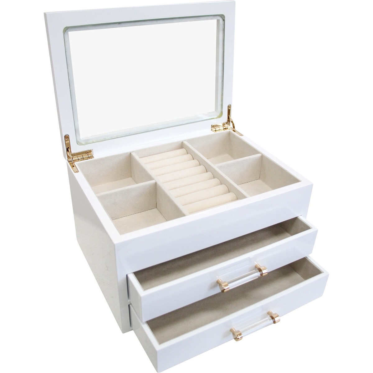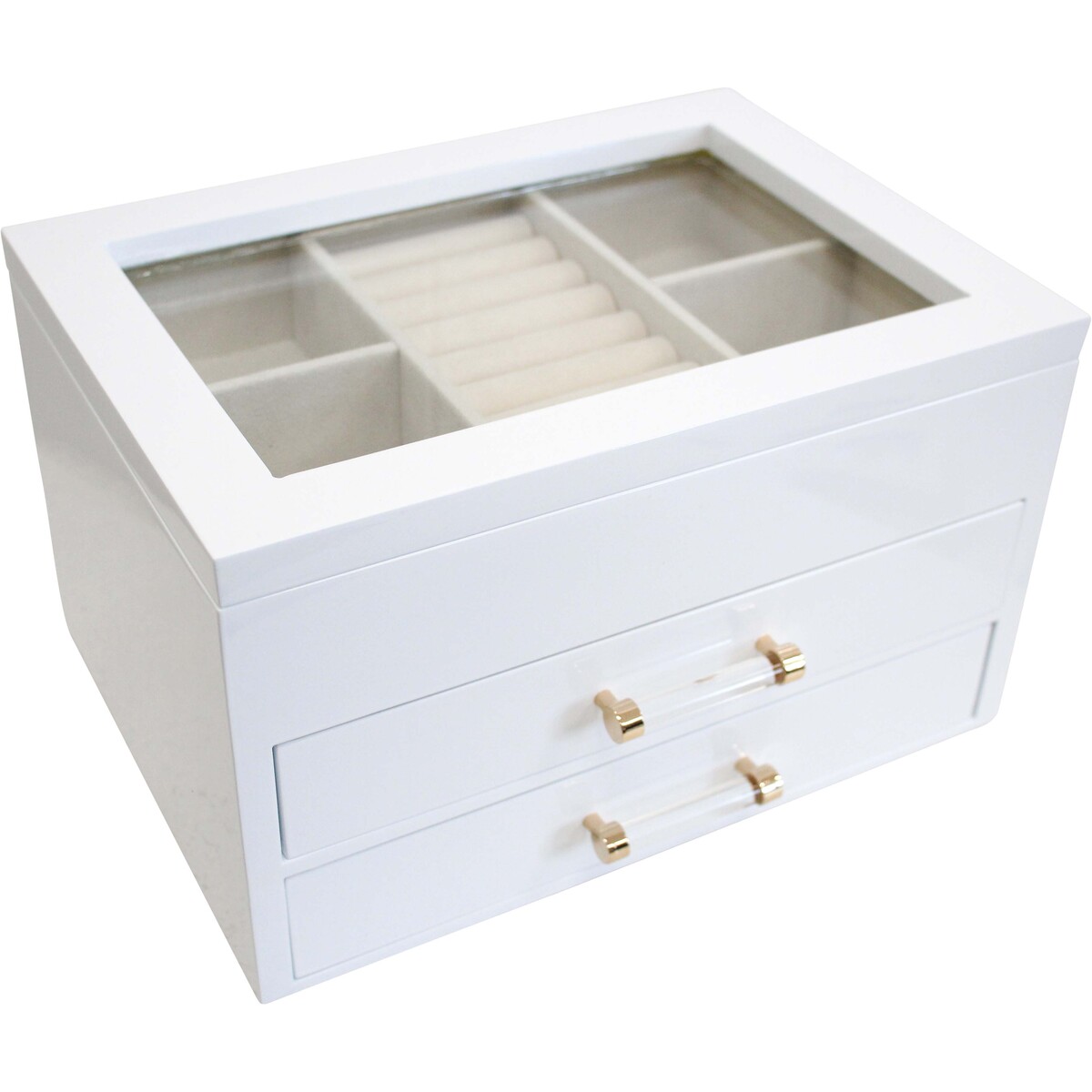 Crafted from high-quality MDF and finished with a glossy enamel lacquer, this box boasts a timeless white hue that radiates simplicity and luxury. Its soft polyester-lined compartments promise to keep your jewels safe and scratch-free, while the clear glass lid allows for a tantalizing glimpse of your treasured items within.