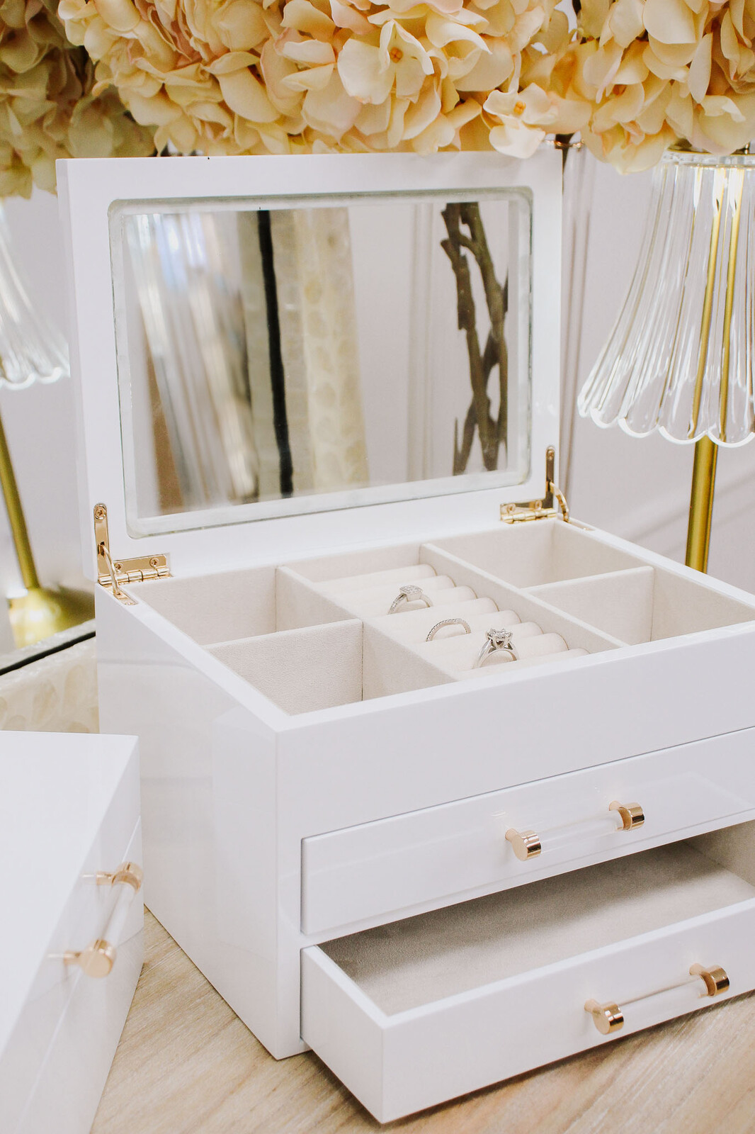 This large white lacquered jewelry box is not just a practical solution for storage; it's a statement piece that can enhance the aesthetic of any room. It's an item poised to become a popular choice among consumers for its blend of beauty and utility, making it a highly desirable addition to your inventory, certain to attract customers with a keen eye for quality and style.