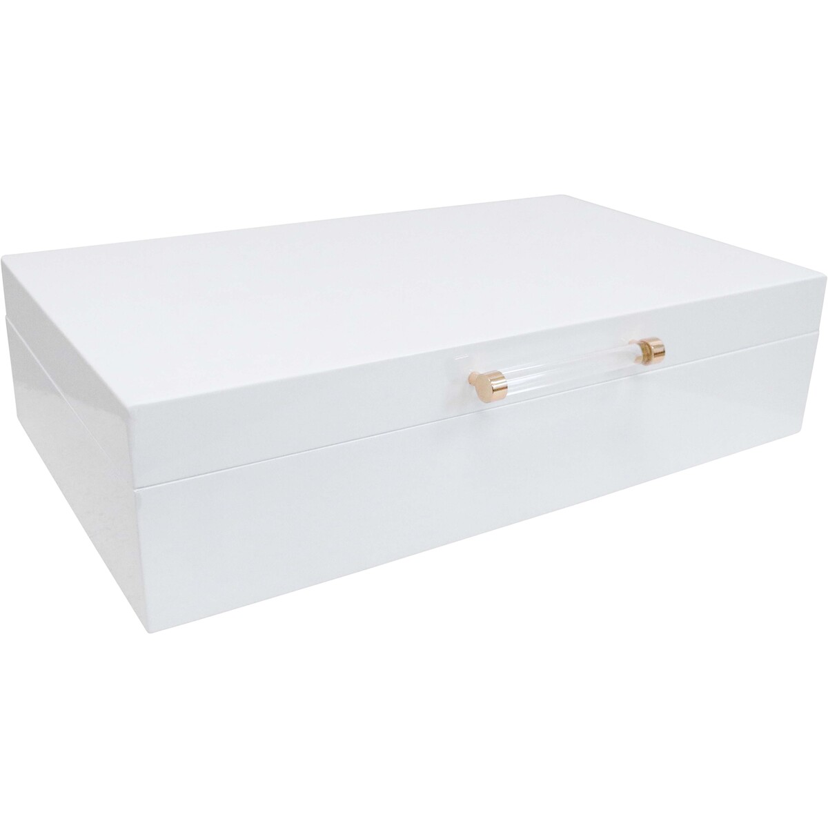 Our Lacquer Long Jewellery Box is really something special for jewellery lovers who want to keep things tidy and looking nice. Its shiny white finish and clear acrylic handles on the lid and drawer make it stand out in any room, whether it's a bedroom, dressing area, or even a professional salon or shop. At 30x18x7.5cm, there's lots of room inside for all sorts of jewellery, from rings and necklaces to bracelets and more.