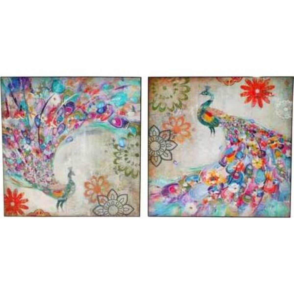 These two peacocks are sure to catch the eyes of any passerby with their playful colouration and intricately lacquered design. Each peacock's body is painted relatively realistically with the blue green colouration that we are all familiar with, however the tail is a hyper stylized abstract design that appears to be an explosion of flowers. The impressive tails feature beautiful pastel shades of every colour in the rainbow, and the peacocks are surrounded by complimentary flowers that do not disturb the eye catching design of the tail. The two peacock's tails will flair out and towards the other one if you hang them side by side. These two images form a colourful and powerful symmetry and balance when facing each other. These two artistic pieces are sure to liven up any area that uses plain or neutral paints. The eye catching design will be sure to attract plenty of customers.