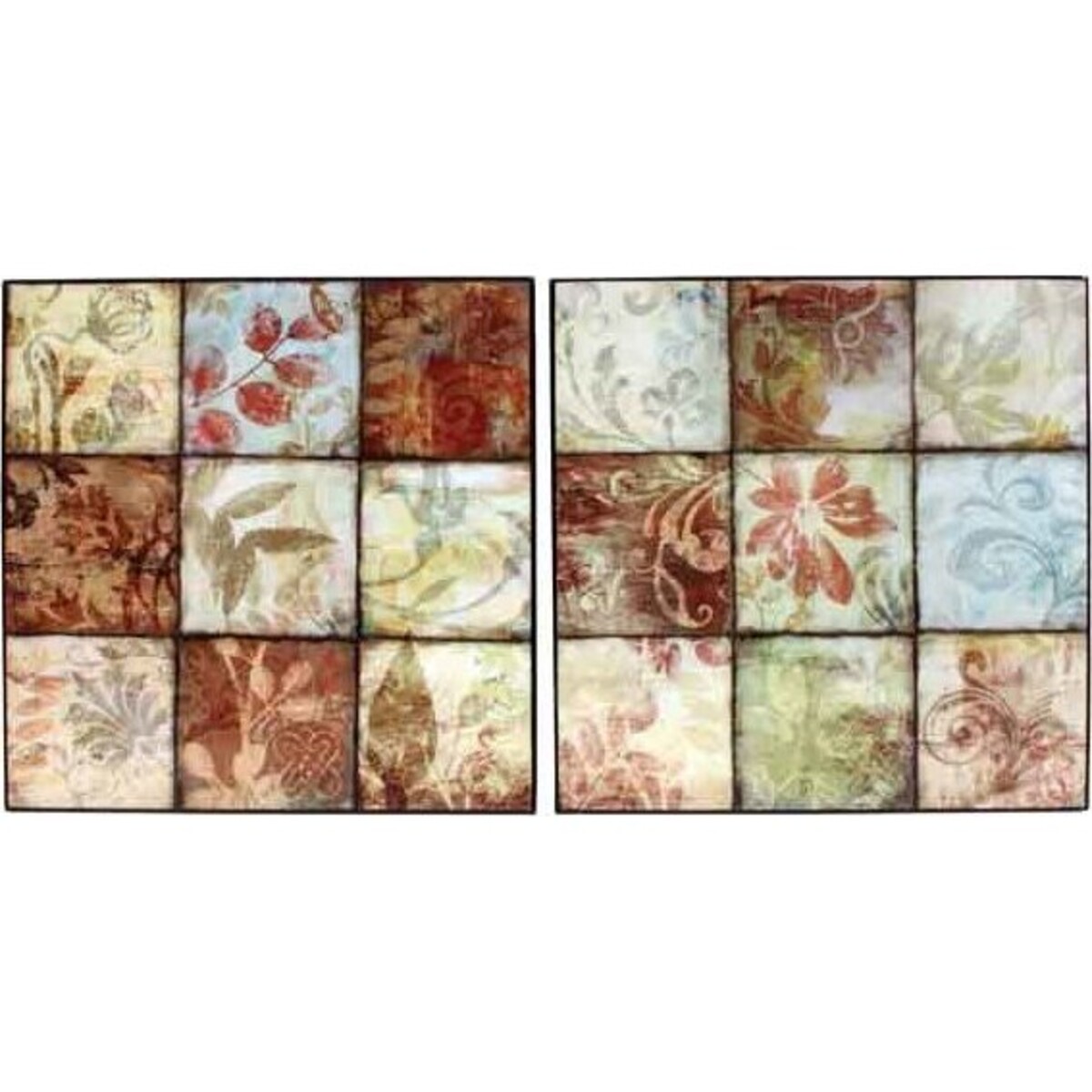 Consisting of two pieces, this wall art features two square-shaped canvases that each features an autumn-inspired art. Each canvas is tiled and divided into nine square sections. Each section depicts a different picture, but all shows autumn scenes which mostly include leaves and flowers that are near their withered stage.