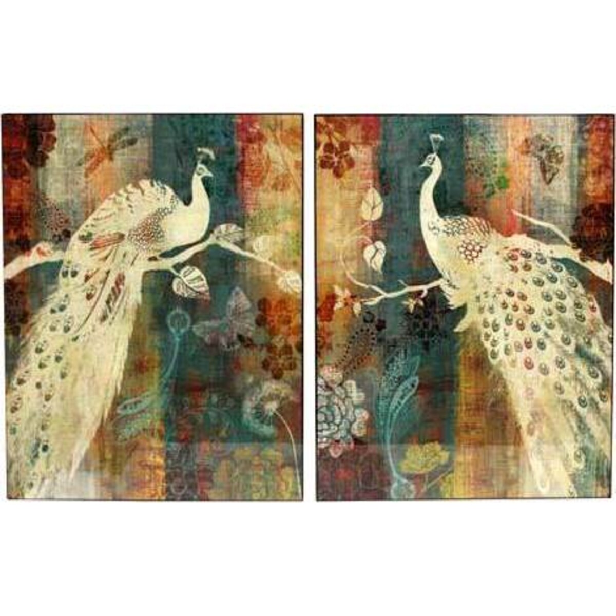 The cream Peacock Lacquer Prints are by far on of the most unusual and eye catching pieces available to buy. Instead of using the wonderful colours of the peacock, the artist has decided to place a pair of cream peacocks on top of a highly colourful striped background. On each of the two prints the peacock is perched on a leafy cream branch, and the background is made up of muted blue and orange stripes, and features a number of small bold prints such as flowers, leaves and butterflies. The cream Peacock Lacquer prints would look fantastic in a neutral room, and they are a great way of adding colour in an artistic way. At 60 x 80 centimetres these slightly elongated but large prints will be sure to catch the eye of any passerby. The attention to detail and the wonderful and imaginative use of colour will make these prints a hit in any home.