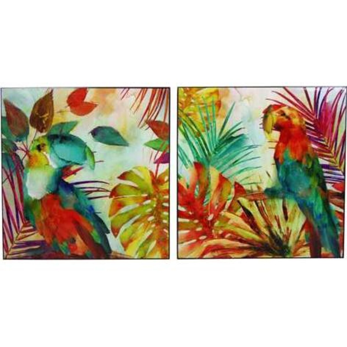 The jungle comes alive in full colour in the Lacquer Print Jungle Birds Print S/2 from LaVida. This two - piece frameless print collection features the images of two tropical birds - a toucan and a macaw - nestled among the lush palms and vegetation of the jungle. The prints are rendered in splendid watercolours of watery blues, fresh greens, deep reds and pinks and vibrant purples and yellows. This pair of prints is the perfect addition to a tropical - themed bedroom or jungle - themed nursery and can be be hung either individually or together for a bigger style punch. Each print measures a considerable 50 centimetres square.