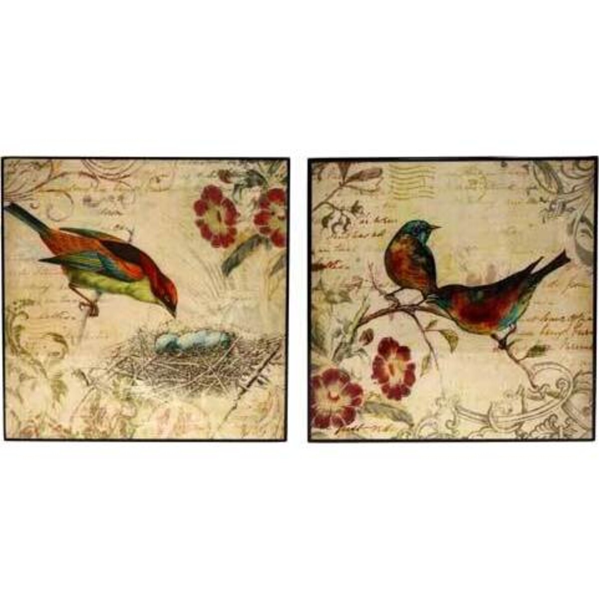 A set of two colourful and homely looking lacquer prints featuring small colourful birds in two different poses.