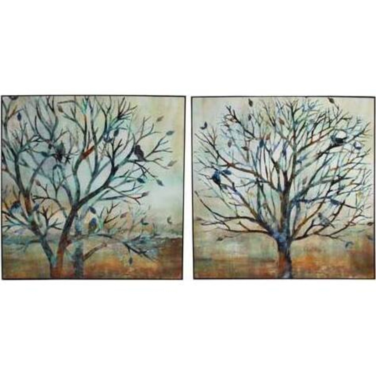 This two piece set of a lacquered print is the best example of a charming piece of art that can match any kind of room decor. This one has the print of a tree with a few birds and a background of dawn or dusk. The scene allows for the print to have lovely earthy tones, which means that it is neutral enough and can be added as a piece of art to any room with any decoration style. In fact, it would make the perfect addition to the walls of an office as well - which is why you can expect this piece to be a big hit with your customers.