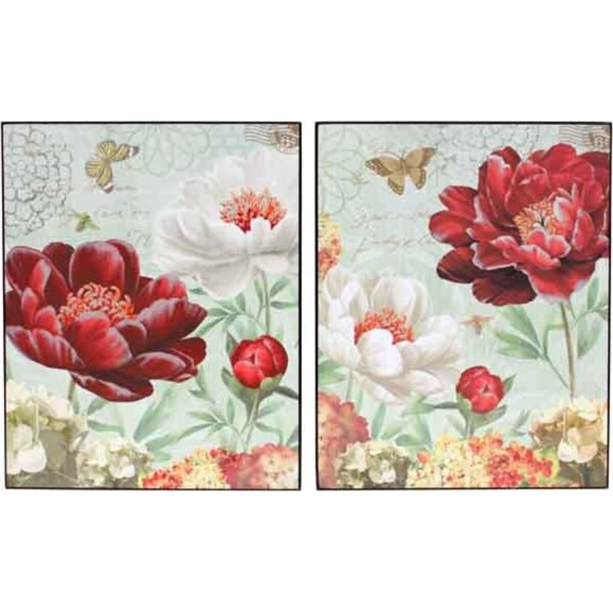 Consisting of two separate pieces, this wall art features a panoramic view of a beautiful paradise-like garden of flowers. It features flowers in bloody red, light fuchsia, and ivory white. The background is in light mint green and the flowers are adorned with butterflies.