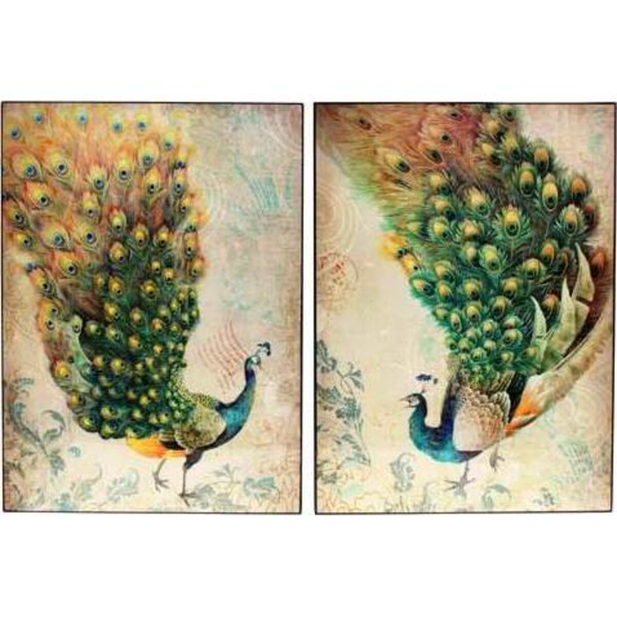 A pair of lacquer print featuring to proud peacocks with their tail feathers splayed out for all to see.