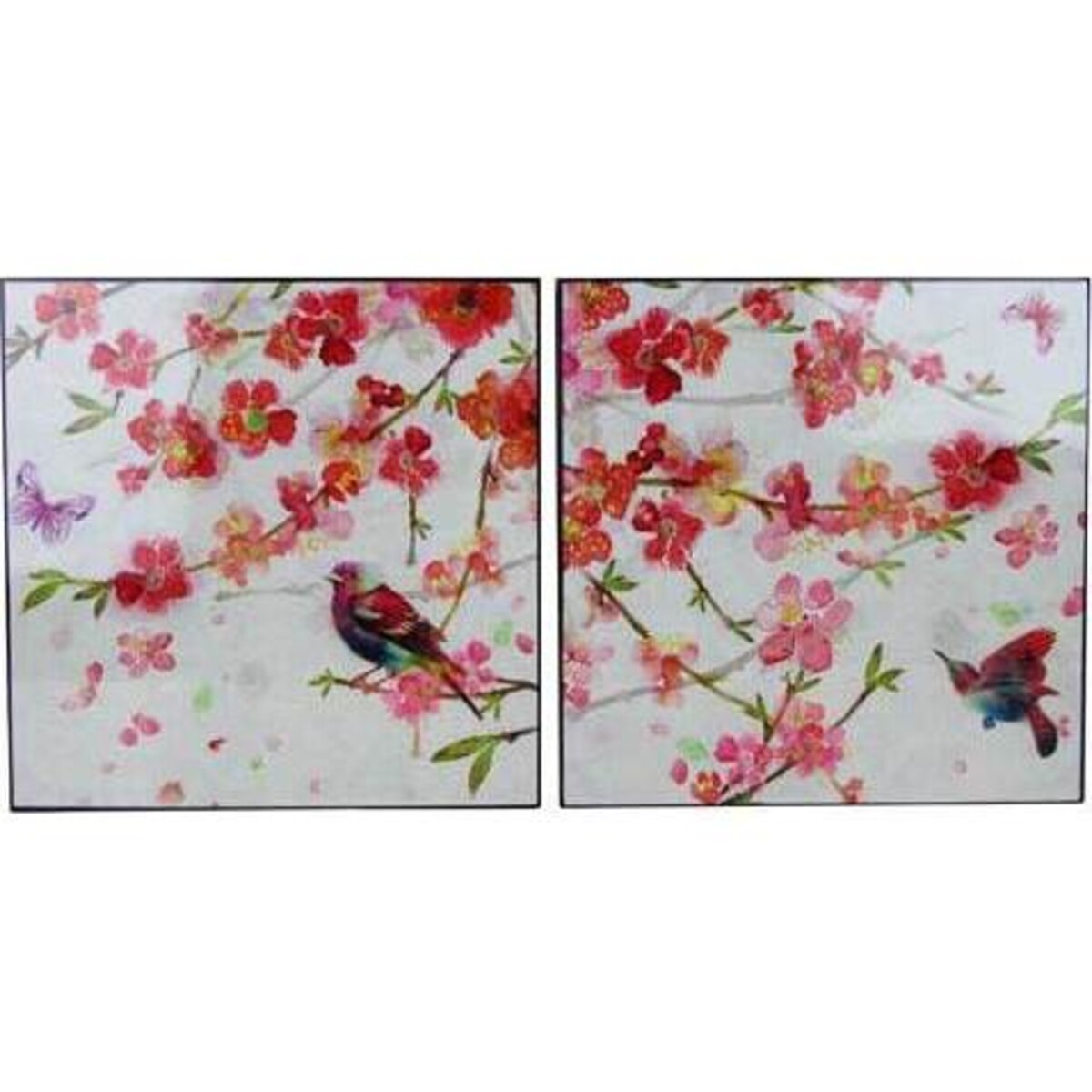 The Lacquer Print Spring Birds S/2 from LaVida features vibrant cherry blossom branches in tones of bright red and rosy pink. Small, multicolour spring birds in blended hues of blue, purple, red and pink flit among the branches and blossoms while butterflies in lavender and pink fly by for a visit. This set includes two frameless canvases, each with its own complementary lacquer print. The canvases can be displayed individually, or artfully hung side by side for the illusion of one continuous cherry tree image. Each canvas measures 38 centimetres square and make a wonderful addition wherever spring vibrancy and colour is needed.