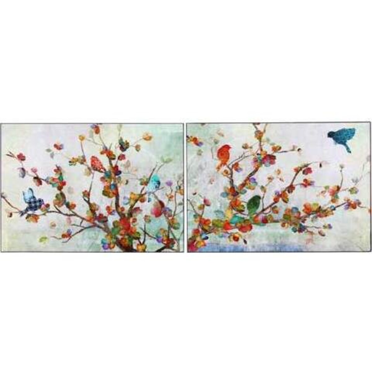 Brightly coloured birds dance among dappled branches in the Lacquer Print Spring Branches S/2 from LaVida. This set of two frameless prints each features the branches of a tree, rendered in strokes and splashes of vibrant watercolour reds, greens, purples and blues. Among the blooms and leaves are equally vibrant watercolour birds, some in flight and some taking rest on the branches. A soft, watery background, keeps the focus on the birds and branches in the prints. At 70 centimetres wide, these prints are substantial enough to hang individually. Hung side by side, however, gives the illusion of one continuous tree in full spring bloom.