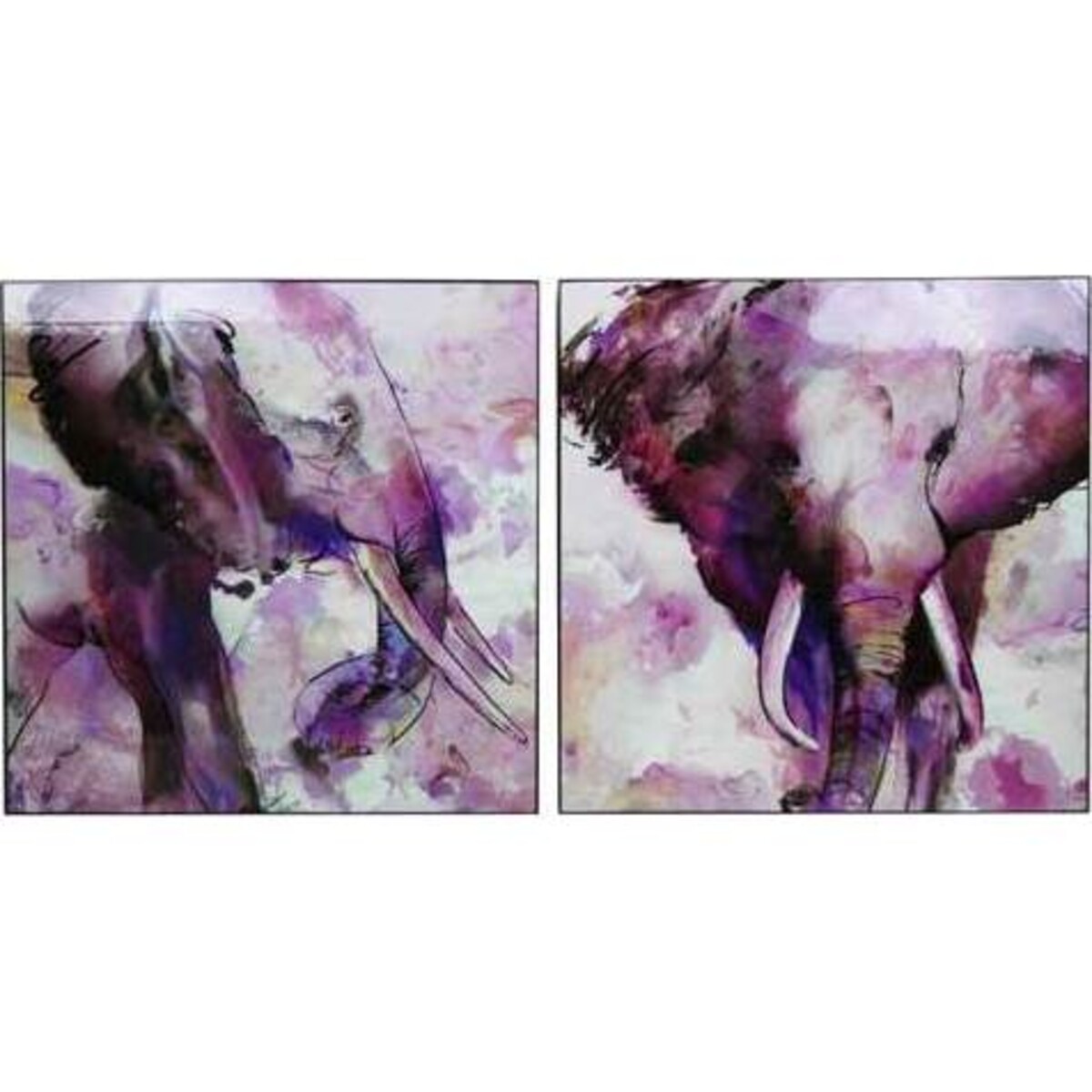 The beauty and grandeur of the wild elephant is conveyed through the Lacquer Print Wild Elephant S/2 from LaVida. This two - piece collection features two frameless prints of the graceful elephant, one with a side profile and the other featuring a forward profile. The prints are rendered in deep tones of watercolour purples, making the elephants stand out like the kings of all land mammals that they are. Both prints capture the undeniable power and the grace of these mighty creatures. Each print measures a generous 58 centimetres square, in keeping with the large scale of the elephants themselves.