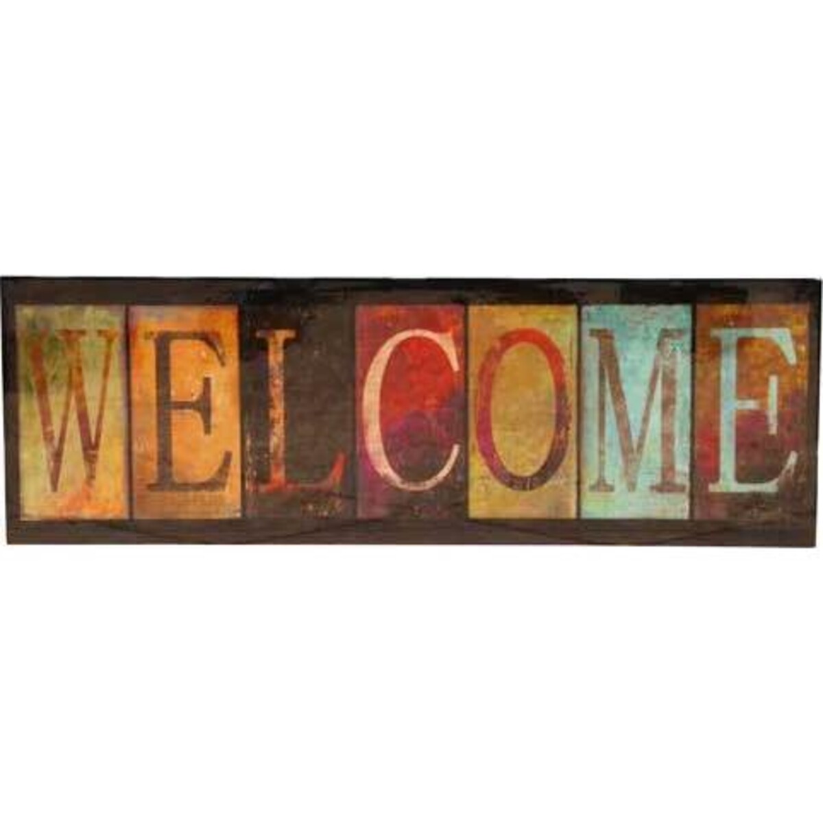 A lacquered piece of wall art that spells out the word 'welcome' using a range of different colours for both the font and the background. An artistic and welcoming design that will work in any and all homes.