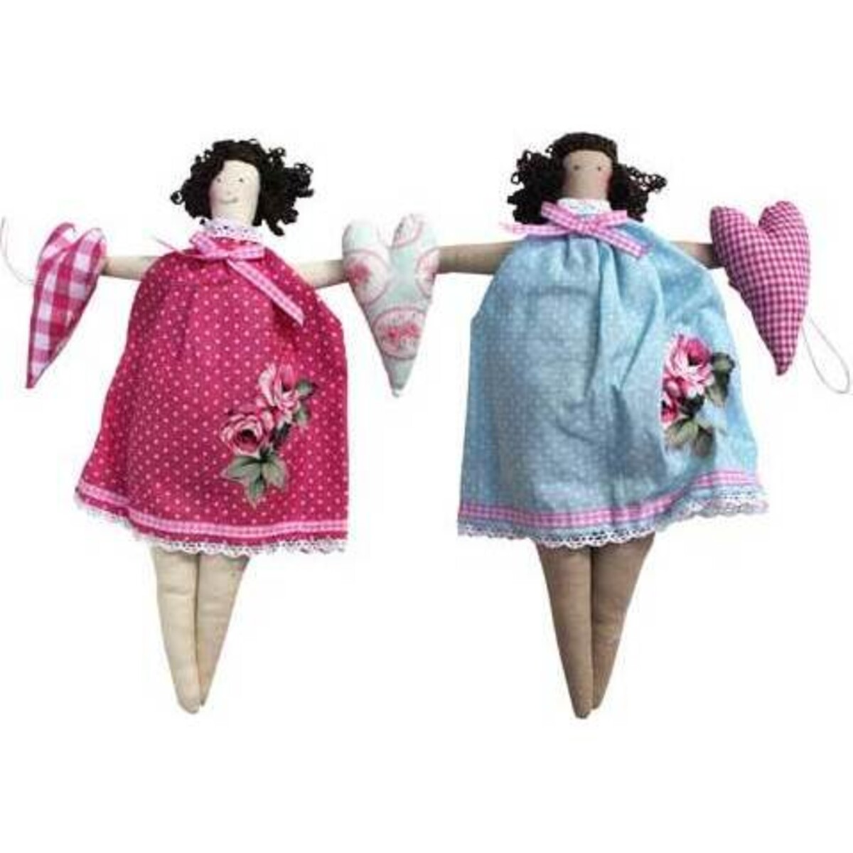 • Two lady dolls are strung together and hold a stylized calico heart between them. Each has her own stuffed heart in the other hand, making three hearts in all. One has dark skin and the other light skin, and both have curly dark hair. • A satin ribbon loop on each outer hand makes them ideal for hanging or stringing with other ornaments. • Cotton polyester dresses have lace trim at the neck and bottom, a bow at the neck, and a pair of roses which are emblazoned on the front. Add this item to your gift department, toys, dolls, and other soft sculpture items. Use it in visual displays with children's wear, infant categories, holiday, and kitchen arrangements.
