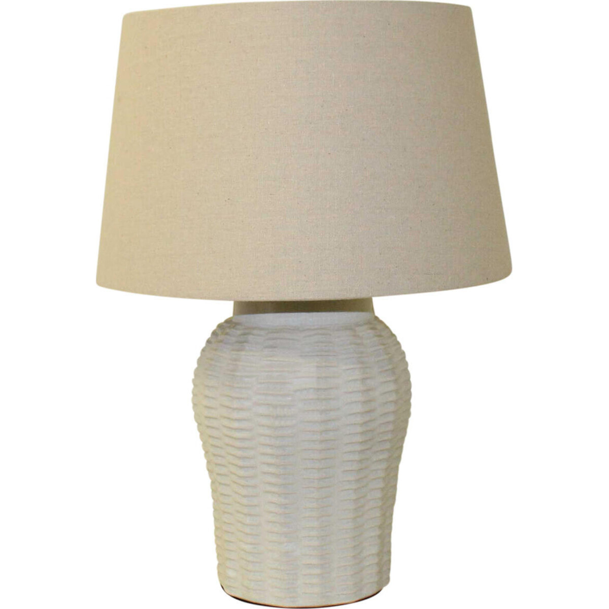 The lamp is crafted of ceramic in a creamy white glaze, the body of the lamp is beautifully curved with a rippled textured finish and it comes with a lampshade that brings out its beauty very elegantly. It gives a beautiful silhouette when lit and looks striking along with white drapes. The lamp shade has a textured fabric finish and casts a nice glow without blocking the light. Simplistic in design with slight off - white colour, it is a great household basic that will seamlessly blend in any type of room or any style of home decor making it an instant hit with the customers and will also match most of the lamps!
