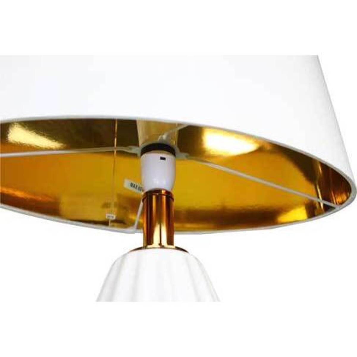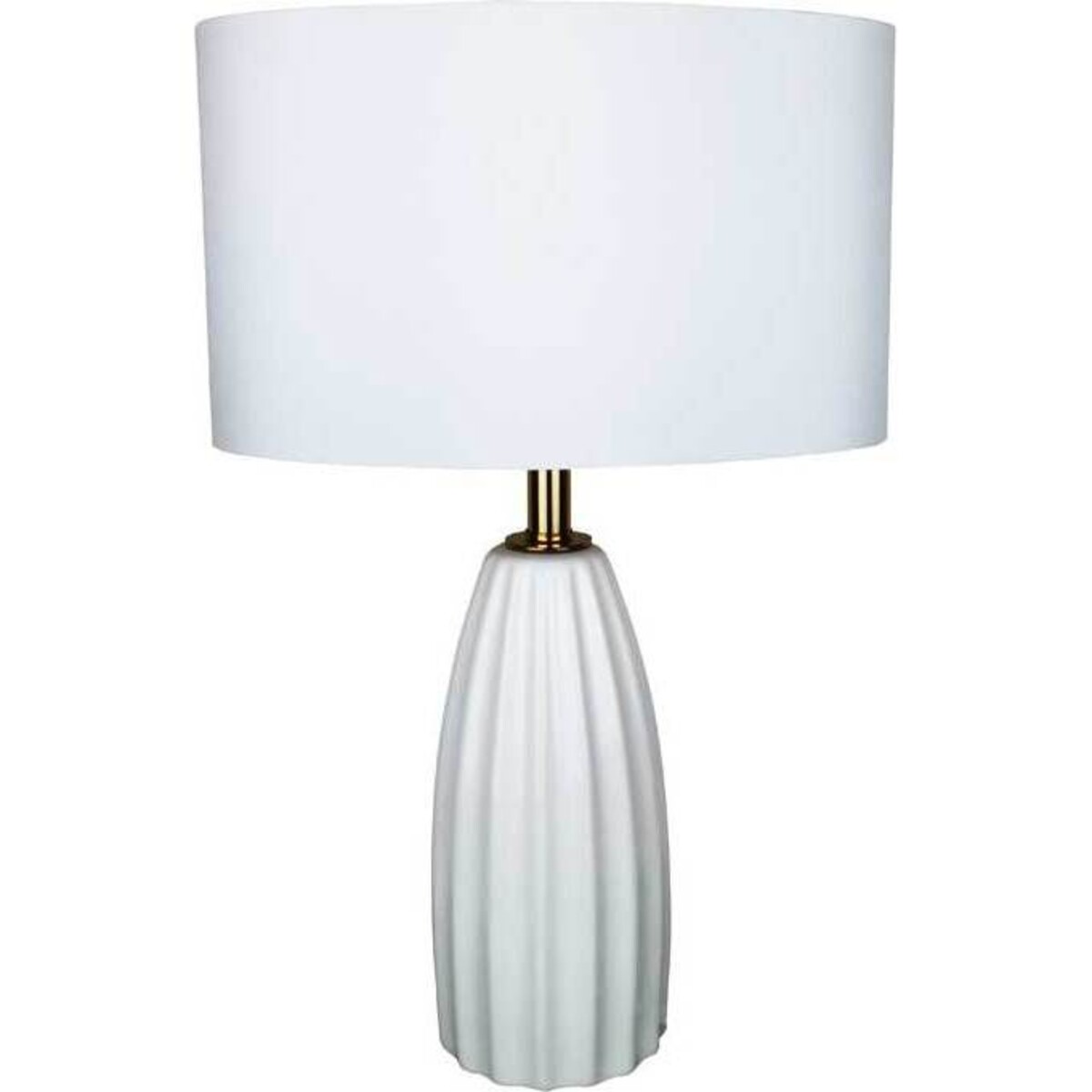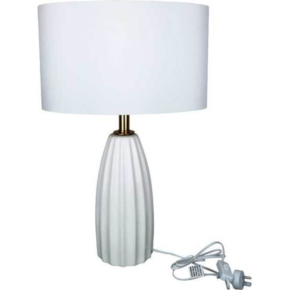 This white lamp is ideal for any style of home decoration. Of medium size and height, this lamp would be suitable for a reading light on a bedside table, as well as a table lamp on a study desk. Its neutral white colour ensures that it will not clash with the colour scheme of any household and will make a lovely addition to the decor. It has a metallic gold holder for the light bulb that is tastefully out of view, and the lamp overall gives the appearance of a tranquil environment. It has a thick cord and socket for plugging in, which can easily be hidden behind its main frame, turning it into a nice piece of decoration as well.