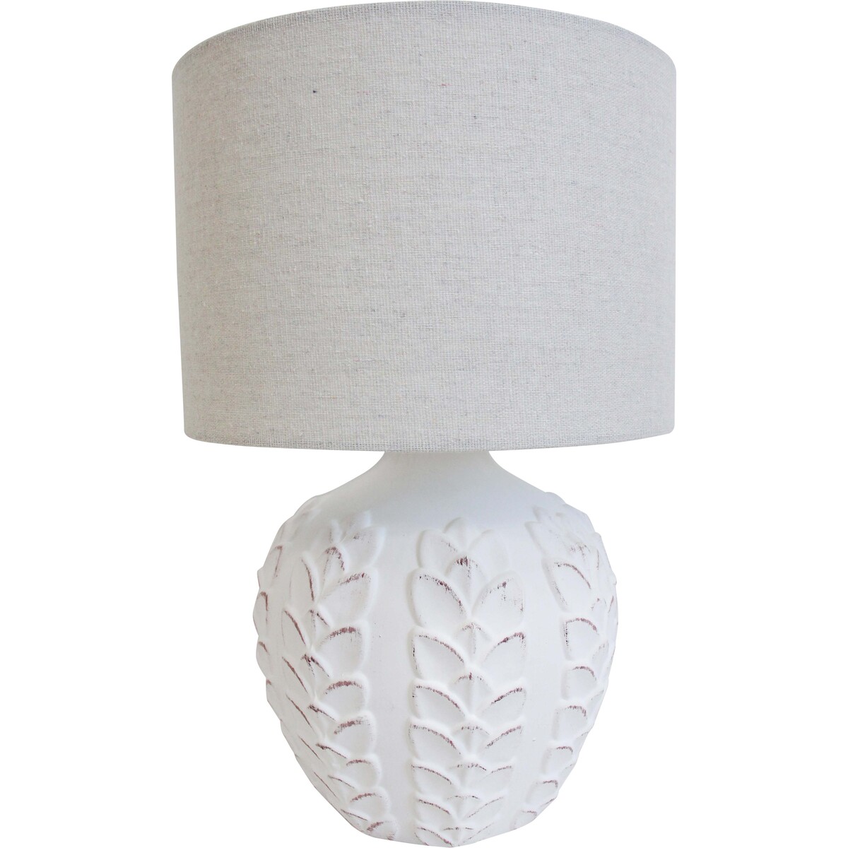 The crisp white shade is linen with a lovely grain, which softens things a touch and gives it enough weight to work with both modern and coastal interiors - especially with those subtle leaf shapes on the base. The Edison Screw Globe fitting works for most settings - we recommend a clear bulb for brighter spaces or frosted for that night time glow-up.