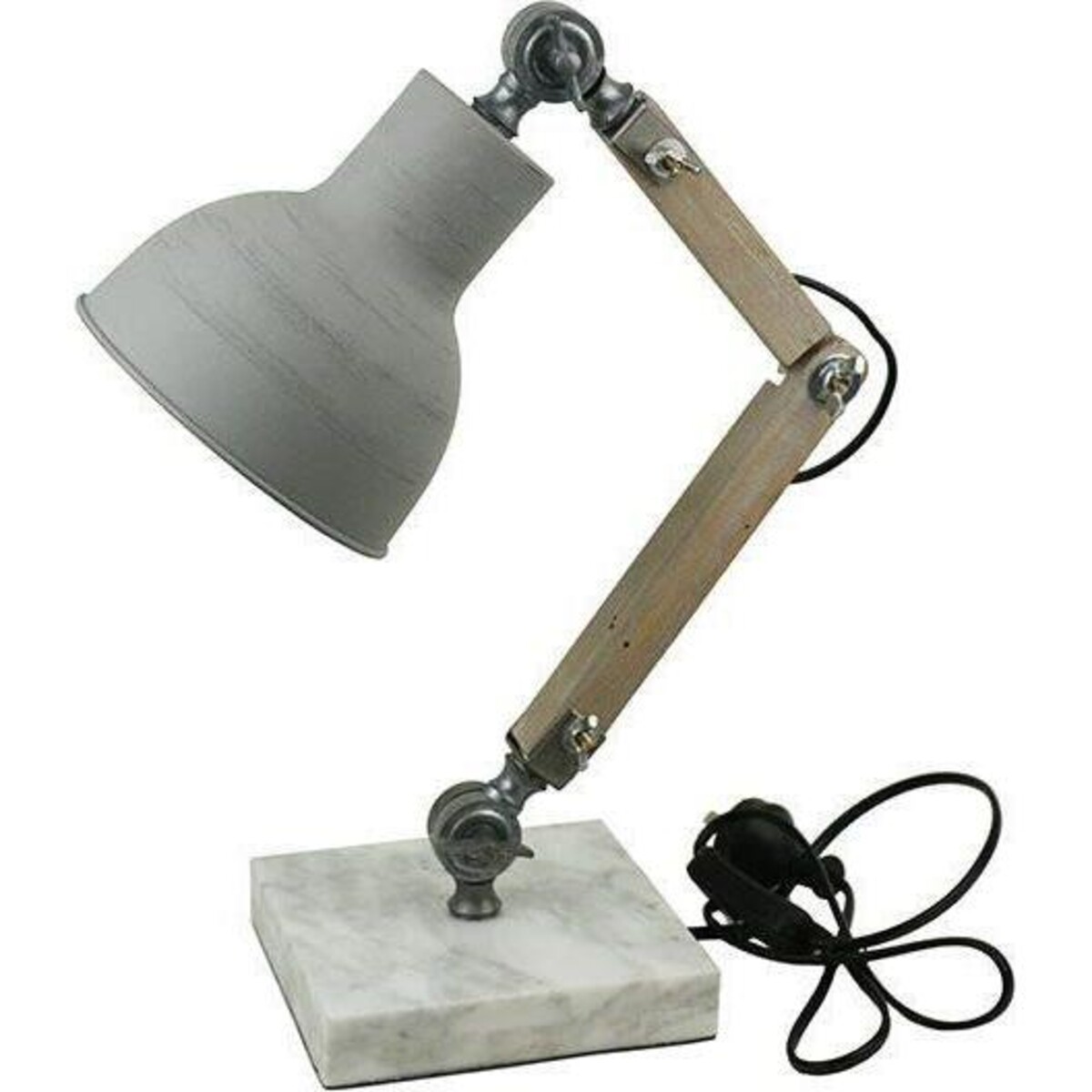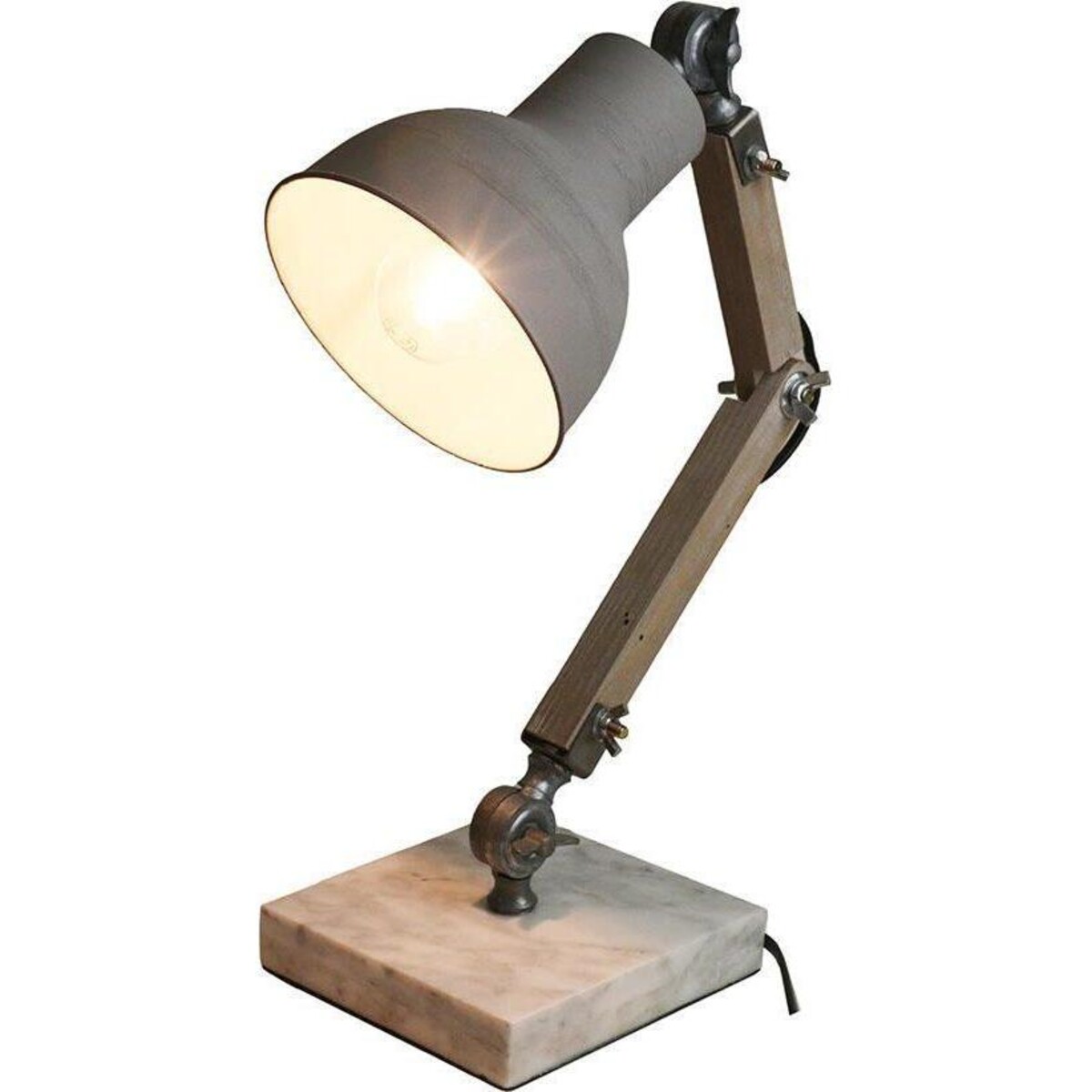 And industrial post modern design that encompasses a varied style of using metal, stone and wood to create a design that looks positively unique. This lamp has an angular structure that is joints made of metal, the base is made of marble in the form of a platform and the round shade has been created from metal. A perfect replica of a traditional lamp that one could see in the industrial era when frill and fancy free designs were the norm. The twist lies in using marble at the base and wood along with metal in rare combination along the arm of the lamp. Can be adjusted in its height and width depending on where it is sued. Would make a lovely display lamp or one that could be used in the children's room as their study lamp. The height of the lamp is 40 cm and its metal shade that holds the bulb has been given the same colour as the marble base. Stable and steady it will make quite an impact where ever it is placed with its unique good looks.