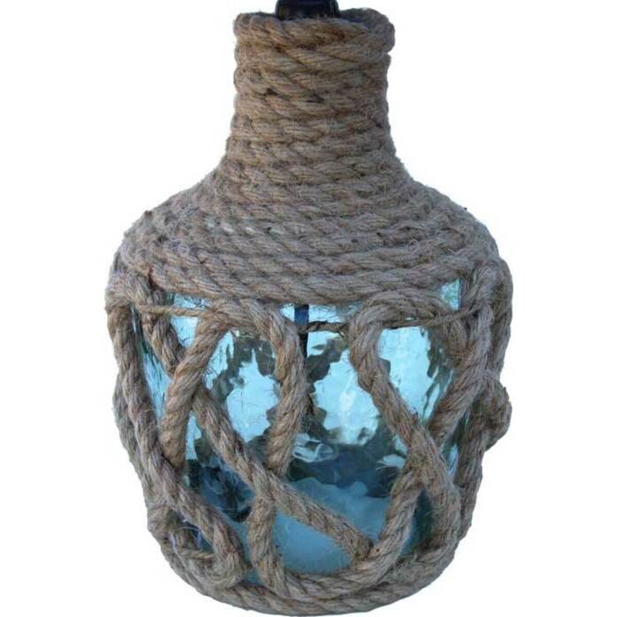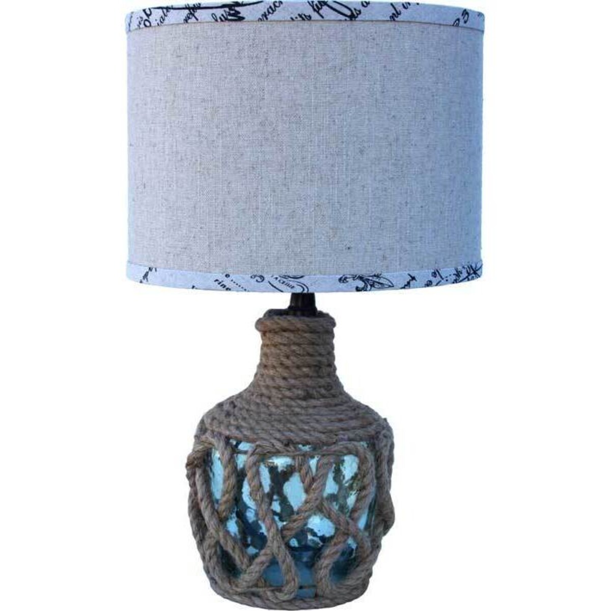 The nautical theme behind this design is both unique and comforting. The denim colour of the lamp shade gives off a homey feel while the bits of scripture add a bit of mystery This lamp really feels like it belongs on a boat or along a pier due to the wavy texture and clear blue colour of the base, both of which are accented by the tattered brown rope. The rope is what brings this piece together. The way it spirals and is kind of worn down adds to the nautical design and almost makes it appear home-made.