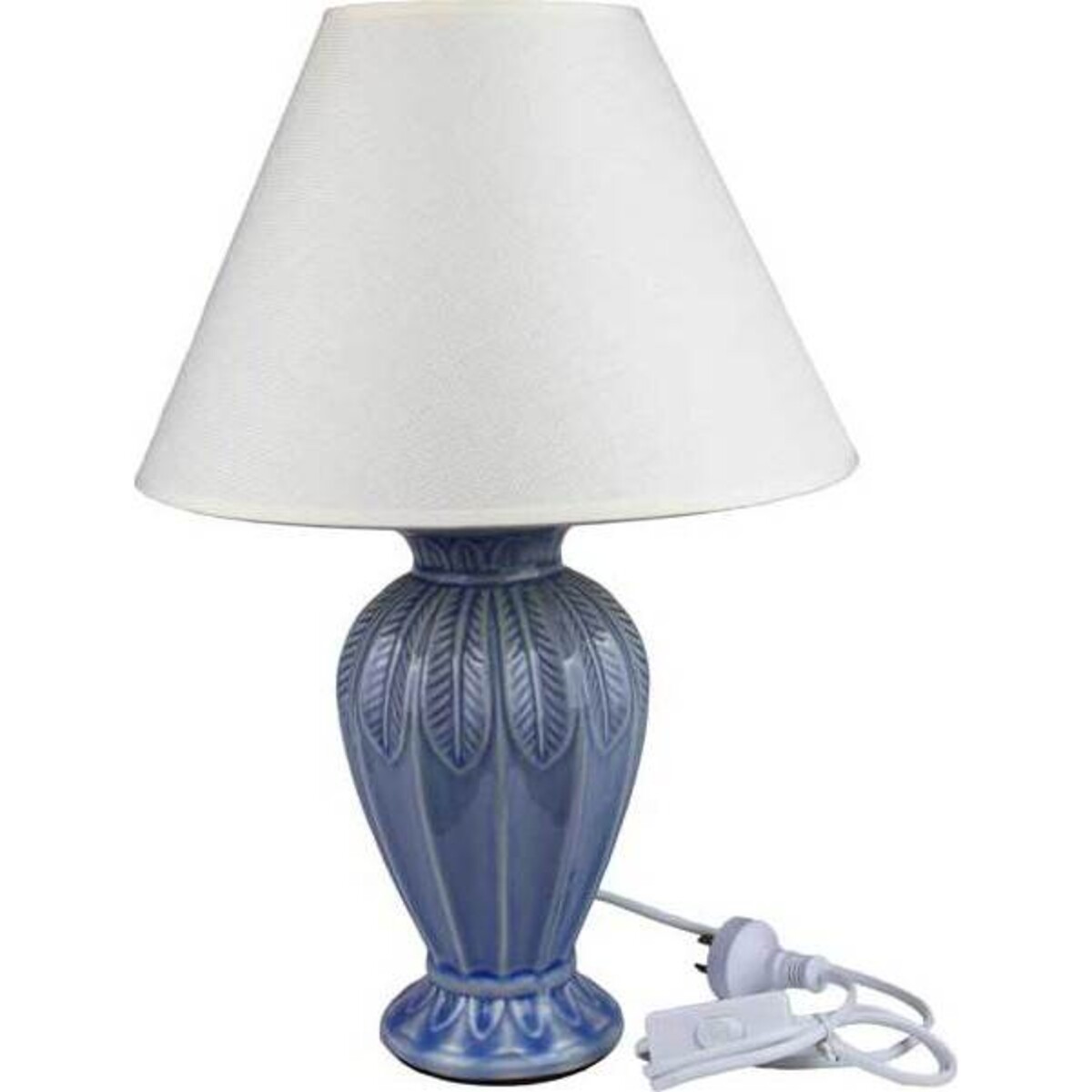 These blue lamps feature a ridged base with a long leaf design around the neck. A white linen lampshade sits on top while a white cord sits is attached at the bottom. These lamps are easy to turn on and off thanks to a push button feature on the cord itself. They're a great way to add style to a space, and although they're lovely when displayed individually, they pack even more of a decorative punch when displayed in pairs, such as one on either end table or at either end of a dresser.