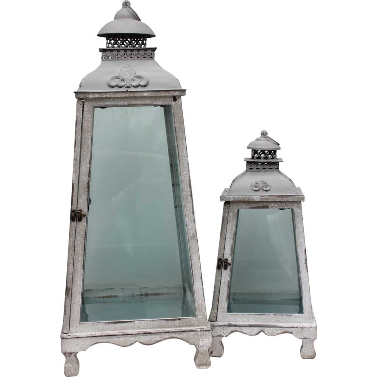 Each also sits on four legs which helps to keep them from tipping over. Pale blue glass panes permit candlelight or sunlight to permeate all the way through without disruption. A latched door in the front allows for easy access to the inside. They have a worn and weathered appearance which enhances their beauty and allows them to fit into almost any type of home d_cor from country charm to coastal chic. A fleur de lis style design graces all sides of the top of the lanterns while a perforated second layer gives them exquisite detailing. The top layer has a ring attached which allows for easy carrying or hanging. Pillar candles in two different sizes are ideal to use with these products. Candles are not included with purchase.