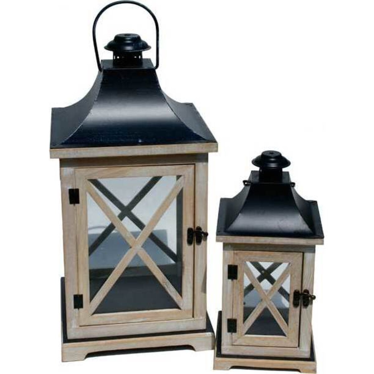 This Black Roof Lantern Set is just what you've been wanting. Each of the two lanterns is comprised of a bare wood base, clear windows, a black roof, black accents and hook handle at the top. Consider them decorative pieces that have a older feel with a modern twist. They come in two sizes and would look lovely wherever you put them. There's no doubt they'll make the perfect addition to your home.