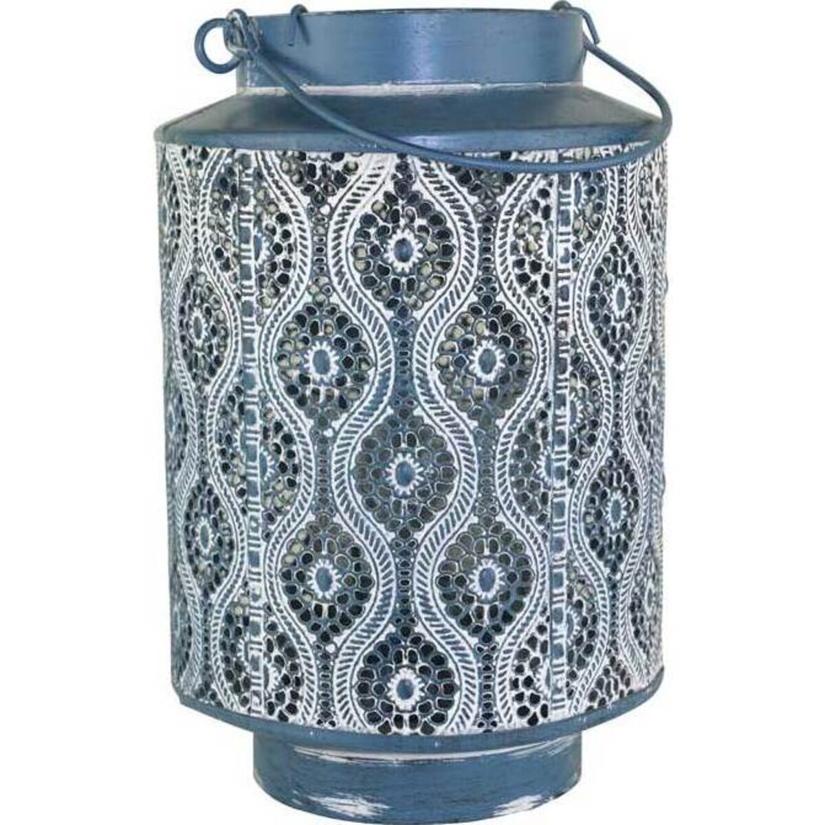 Lighting does play a very important role in making spaces come alive with a character of their own and if it is lanterns that is going to be used then there could be nothing more special than this Lantern blue Oggee that reminds one of the narrow by lanes of Marrakesh or Istanbul ,the magic carpet and the world of wonder below-truly one of those add-ons in the decor that will make the mood exotic and dream like. The lantern is about 21 cm in height, is cylindrical with a diameter of 15 cm and has filigree design all over in metal covered in dull blue powder paint that has been given an antique finish .Inside the lanterns is candle holder in glass that will allow easy placing of a pillar candle that will not extinguish even as conditions do get windy outdoors. This lantern could sit atop tables or on the mantelshelf or be placed outdoors too. It has a ring handle for carrying and around stable base. Would be loved as a gift by all those sold to eastern charms.