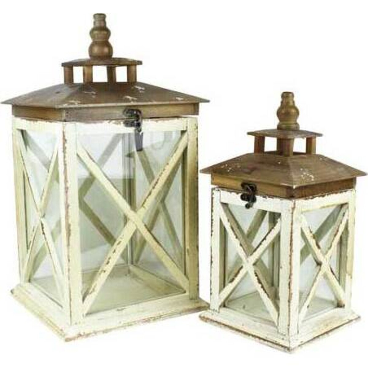 These lanterns have a white painted wood base with a clear glass pane on either side and a white wood "X" over each one. At the top is a natural wood lid that stays closed thanks to the help of a latch at the front. You can use these beautiful decorative accents for a variety of purposes ranging from holding candy to allowing you to display faux flowers in a unique way. You'll love how much beauty they bring to any area in which you keep them.