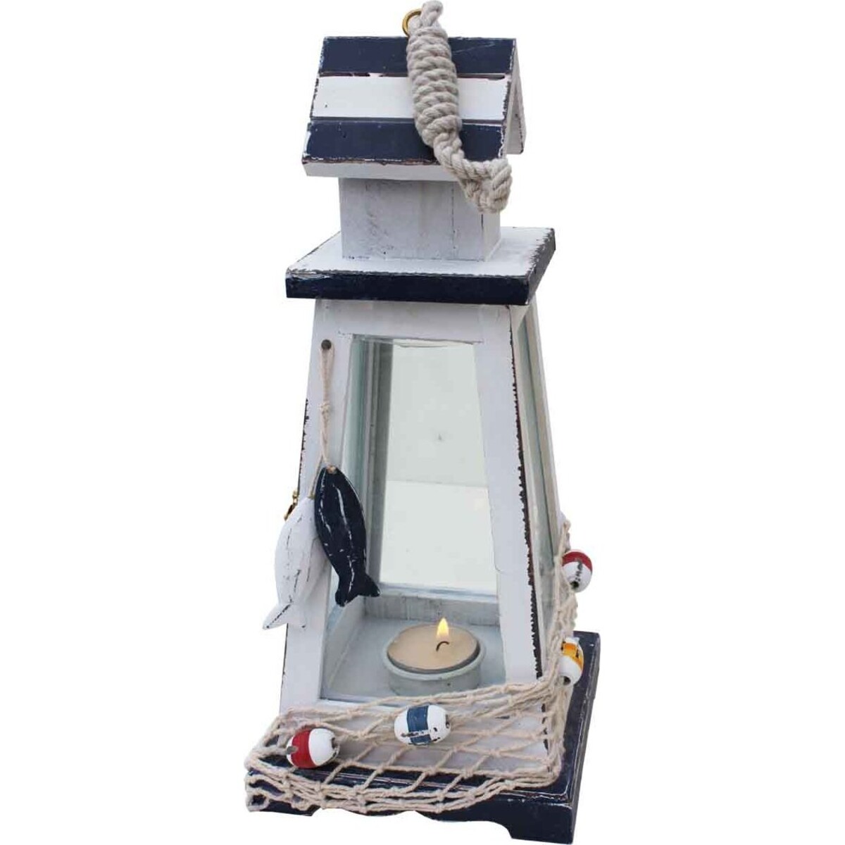 On top of the lantern is a small box house where the handle of the lantern is tied to. The lantern has a fish net wrapped around it, which also has colourful bouys tied or caught in them. At the side of the lantern hangs two fish of white and blue, making great accents and ornaments.