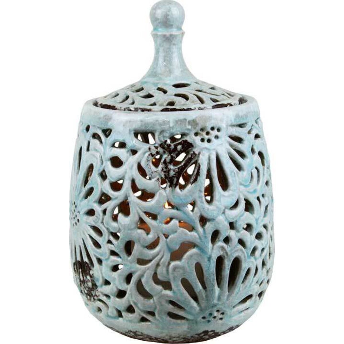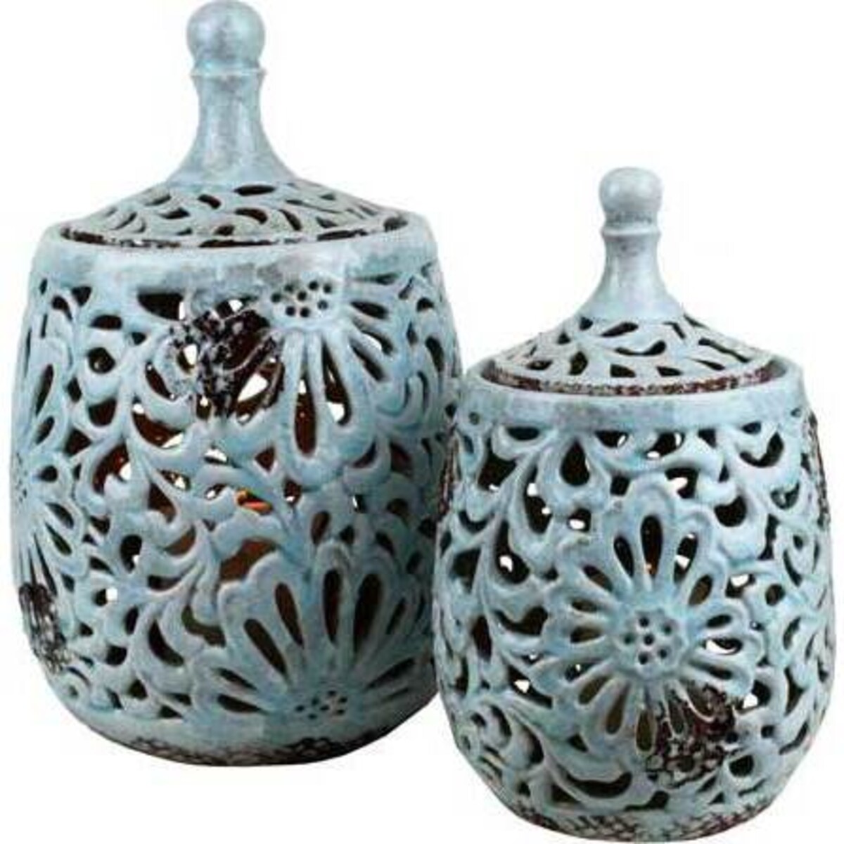 These lovely decorative accents consist of a light blue swirled floral base and lid that's complete with a ball handle on the top. Dark detailing is strategically placed on certain areas to give the lanterns a vintage feel, as if they've been used for years. Tea light candles are ideal to use in these decorative accents, and the light will shine through beautifully. They're perfect to display on a mantel, end table, dresser, or anywhere else that could use a wonderful touch of light and beauty.