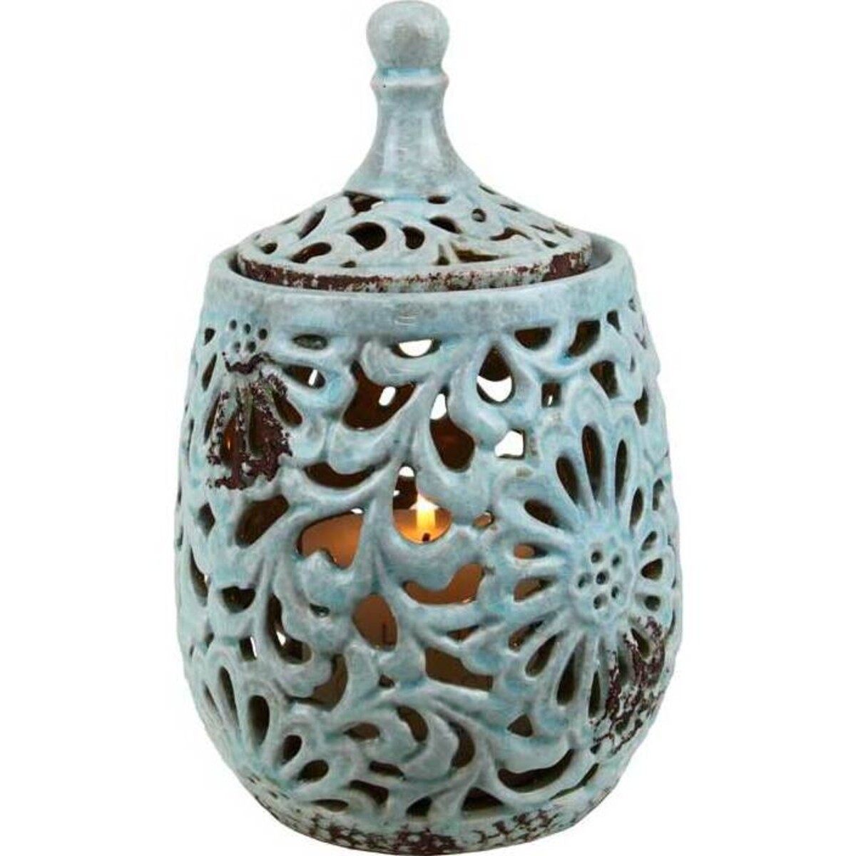 These Small Cascara Burst Lanterns from Lavida will definitely catch your interest. They feature a cut - out floral design over the light blue base, as well as brown detailing that makes the lanterns have a vintage feel. The lid at the top has a ball handle, making them lovely yet easy to lift without a problem. Small tealight candles fit perfectly inside these lanterns, and the light shines through beautifully. Not only would they be wonderful to display in almost any room of your own home, but they're just as wonderful to give as gifts to those you love.