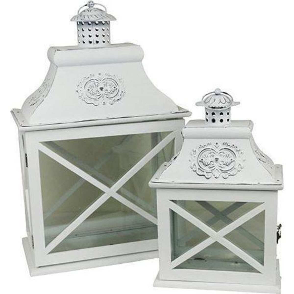 Lanterns can be a great means of creating ambient lighting and when they themselves have looks as pretty as this set has they add much more to the décor setting as well. This set has one rather large lamp and one that is slightly smaller in size. They come with metallic bodies and have doo like hinged openings so that one could place pillar candles with then their compartment with ample ease. The space within is large enough to accommodate two candles in the case of the larger of the two. The glass panes have archaic cross pattern in metal and that is what adds more of the drama to the design. The lanterns have this raised chimneys like projection on the top above which is the handle that is truly well designed to allow one to carry and place it wherever one may want to - maybe in the corner of the garden, or a special corner in the hallway or entrance of the home, some lonely little space in your living room that could do with something as exquisite as this to raise its bar of good looks. The metal and MDF fabricated set will see you through all these special occasions demand when the house has to be made to look a little bit extra special. Vintage, classy and farm and country feel homes will all revel in is beauty.