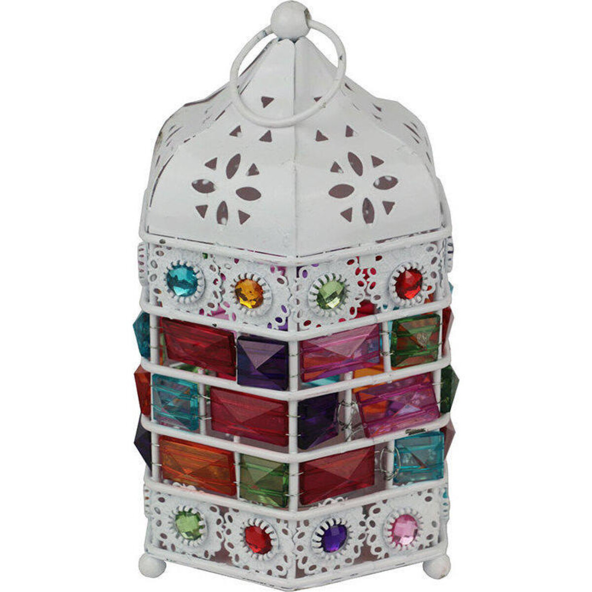 This is a wonderfully structured hexagonal lamp whose each facet is adorned by multicoloured glass piece that will help create the most wonderful lighting effect in your surroundings. A pert little piece which despite the fact has been crafted from metal, will be easy to place on any part of the house or in the outdoors. The lamp stands of tiny little round legs and has a perfectly balanced shape. The inner cavity is a little compartment where one could place a medium sized pillar candle that will be enough to light up a substantial space. The lantern has a white outer body that will make it fit in with all kinds if sober decor palettes that are not necessarily bright or eastern in influence. Make small effort by adding this lamp in your surroundings and help your space achieve the mots amazingly dramatic impact with a simple inclusion.