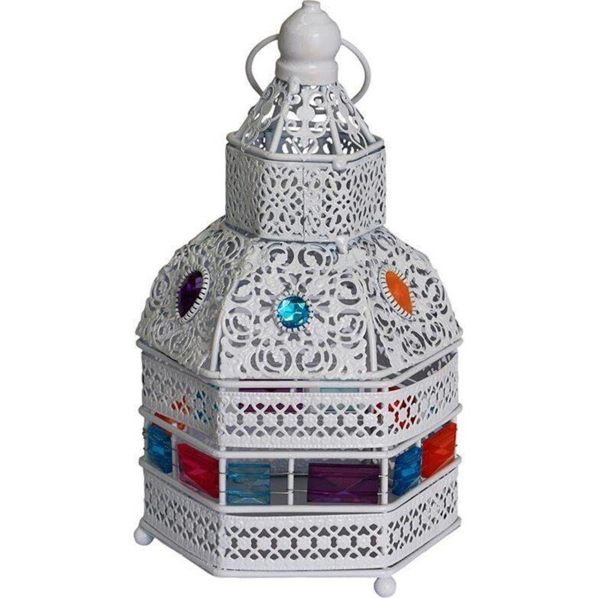 This lantern has a dome shape and the upper portion which rises as high as 21 cm has a built in ring so as to aid the holding of the lantern very easily. The lantern is faceted and since it is angular its light will pan out all the more beautifully in all direction. The lantern is all of 12 cm in its width across from one side to the other. The coloured plastic pieces on the sides make the lights infused with a gorgeous colour which makes its effect more dramatic and one of a kind. Mid eastern in its design, it will look best n hoes that have a classic elegant feel or the ones that want the look that hinges on multicultural roots. Team it up with a pillar candle that can be placed with ease within its cavity. It can be opened easily from the top as there are hinges that allow the top to be flipped open and then placed back. The filigree work n the lantern will cast a gorgeous lattice design all around this lantern that will create an aura of exquisite beauty all around.