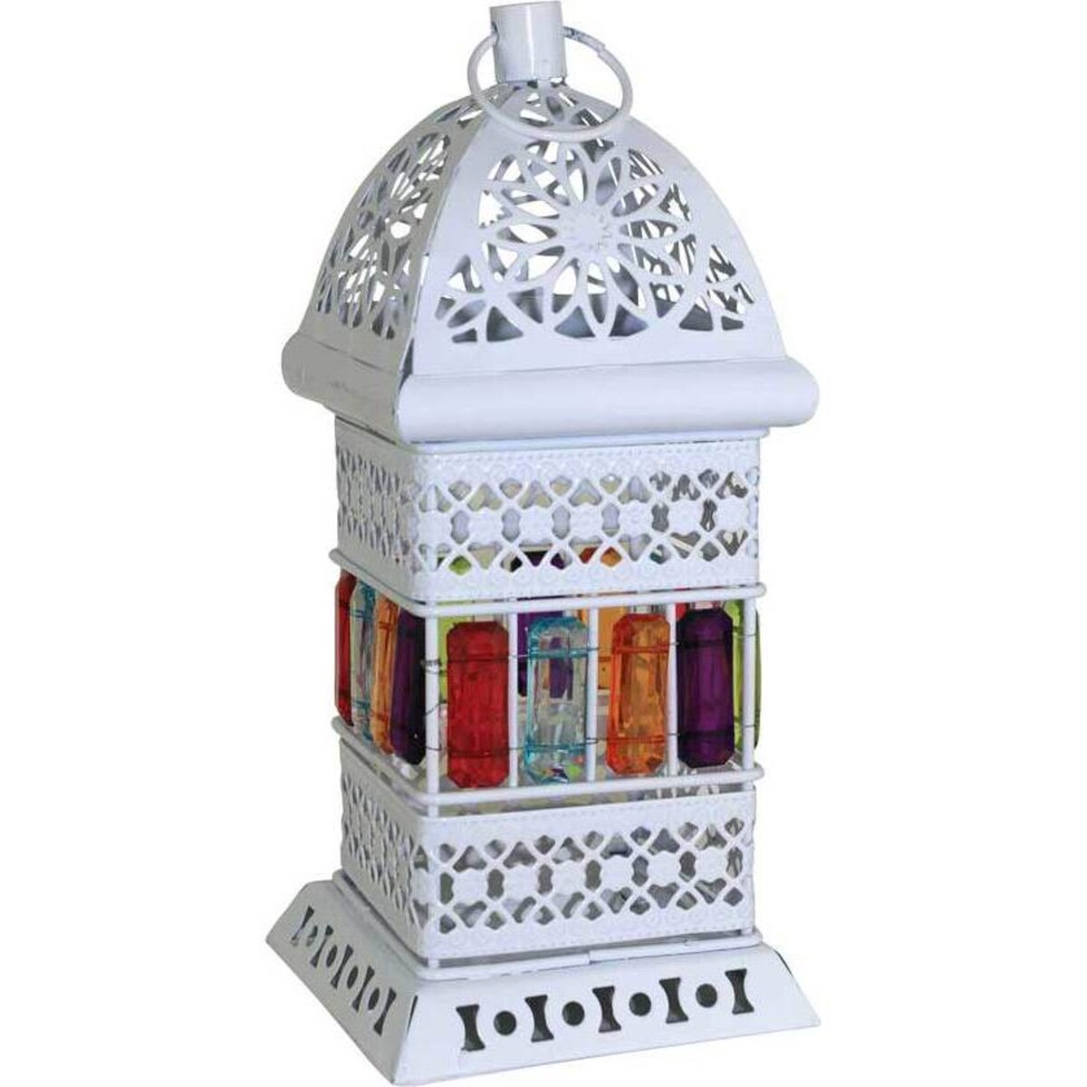 A lantern shines more when its exterior is as brilliant as its interiors. This metal hand crafted piece comes with a lattice cut design on the dome as well as the body of the pillar shaped body. The dome on top has different detailed design while the lower part has a different pattern. The white paint looks fabulous as it contrast vividly with the gemstone colour glass pieces that surround the vent around the votive area. The candle or traplight maybe placed with ease by simply lifting the dome with the help of the ring. The colours such as deep red, peridot green topaz yellow and aquamarine makes the lantern unique in its range of colour play. Will not just help light up the space with beauty but also add so much colour and warmth. A single definitive piece in the decor can make all the difference in the decor. The lantern is all of 22 cm in height and about 10 cm in dimension of its square shape. The base is solid and also has a delicate design all along the base. Can be kept in corners, the dining table or made the centrepiece in bigger arrangement. There are so many ways that this single piece will build the oriental theme in all its luxurious connotations.