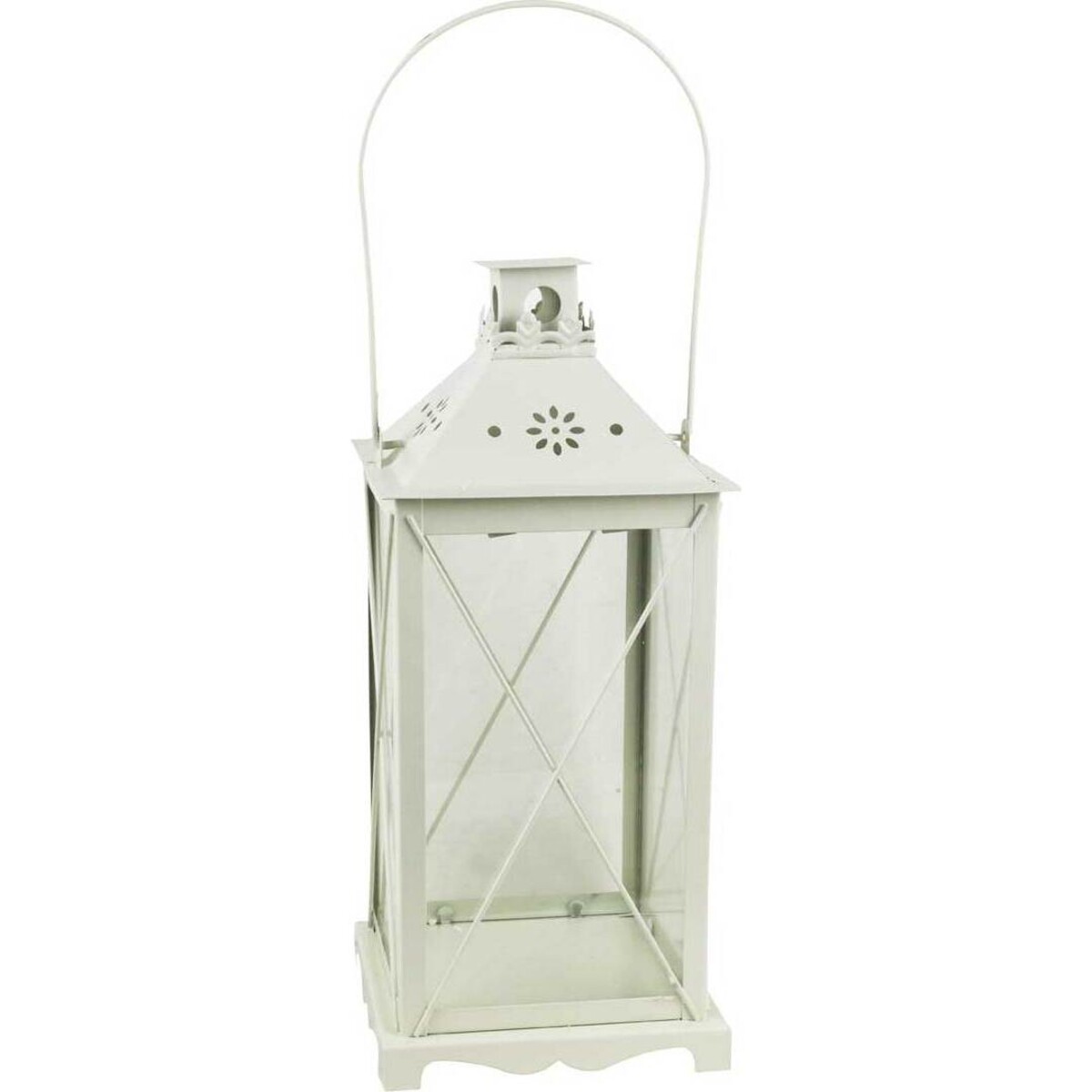 This lantern painted white, is fabricated from tin and is thus quite lightweight and truly ancient in its design concept. The typically antique look has been created from the pane design, the manner in which the top of the lantern has been given this definition of design with a floral cut and a tiny little raised peaked chimney. The white paint takes away the obvious rustic look giving it a more delicate feel while all the while maintaining its very country and farmhouse look. One can place a pillar candle of large to medium size as the structure of the square space inside the lantern is round 14 cm in length and width. The height being 32 cm makes it a fairly large structure that can be easily kept in the corner to illuminate large acre. One could also place up to two smaller pillar candles within and its glow will make a huge difference to the decor. Can be easily shifted around with the aid of the curved tin handle. The advantage of tin is its lightweight nature making this lantern thoroughly usable and versatile.