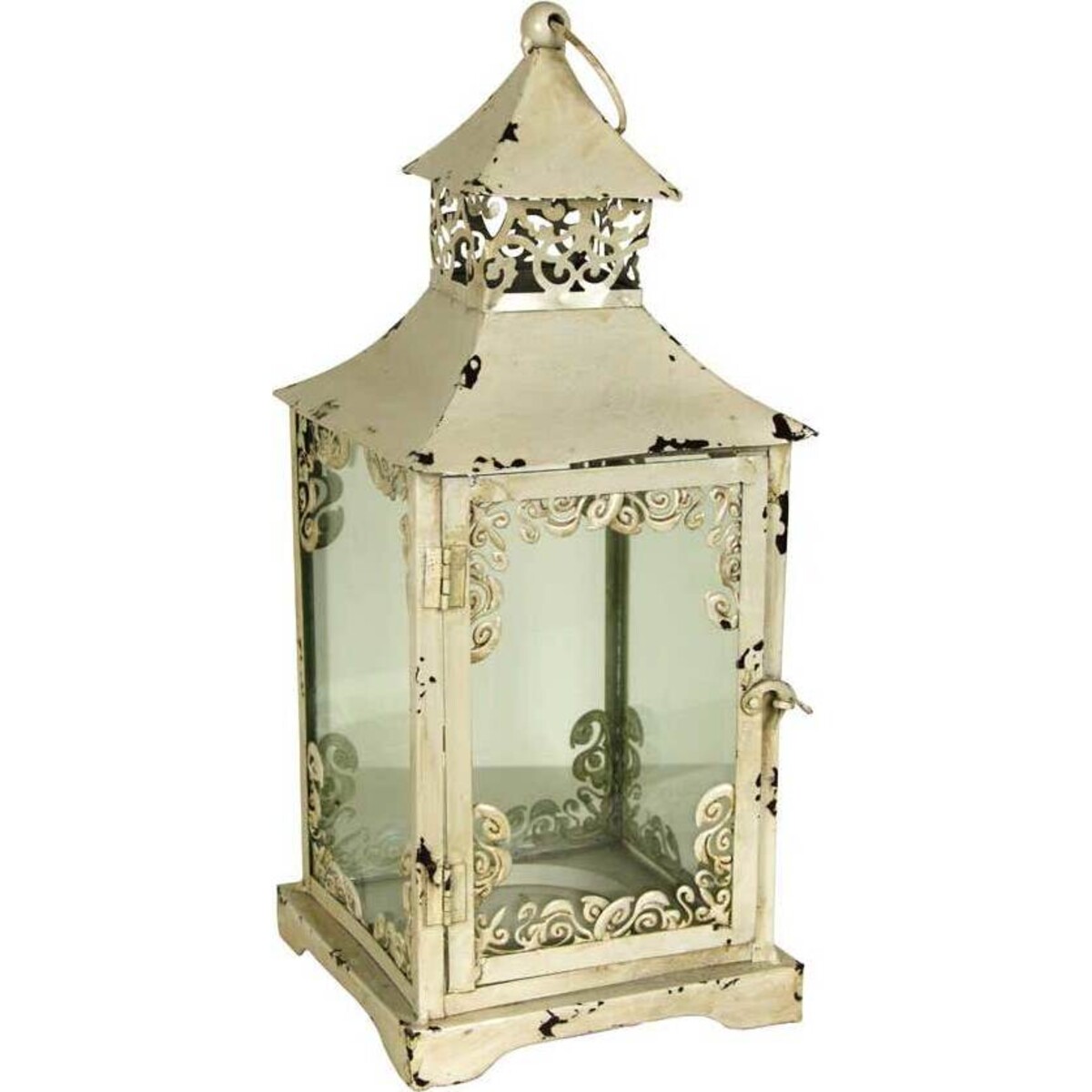 Lantern Frill Edge is a uniquely - crafted housing made of metal and glass for fitting in lanterns. This piece of hardware looks appealing at first glance, with the metal framework having cream colour. It measures 19x19x48 cm, with the top - most part resembling a roof - top. Homeowners may acquire this product for use at different spots of the house, both indoors and outdoors. They would look great pitched at various points along a high perimeter fence. Lantern Frill Edge offers sufficient room for illumination through the transparent glass employed and has good allowance at the top as well for effluent gases.