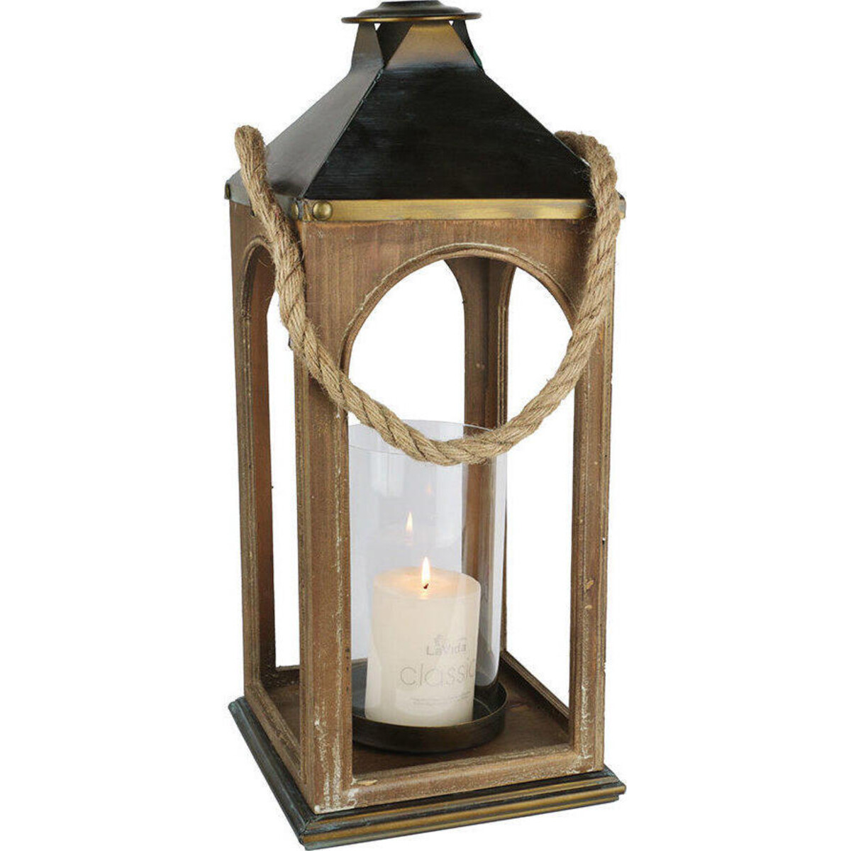 Make a small change and reap the benefit of a big difference - here is a classical means to add ambient lighting to your spaces. Add this lantern created from the usages of three varied materials - glass, metal and wood. The superb design is minimalistic, while the metal gives strength, the wood usage brings in the freshness of the country. The pillar candle will be encased safely inside the cylindrical glass structure that sits on the small metal platform built on the flat base. The square shaped lantern has a rising peak that has been created from dark coloured metal with hints of gold. The rope attachment lends it a touch of rusticity making the design achieve another detail. A superb means to not just add floor lighting along drive - ins or pathways as this tall 50 cm high lantern will make quite a majestic statement even when kept at floor level, and if placed as a pendant light as well it will make its mark. A classic look inclusion that will keep your interiors as well as exteriors feel the excitement of great lighting.