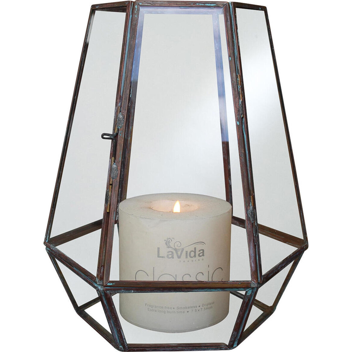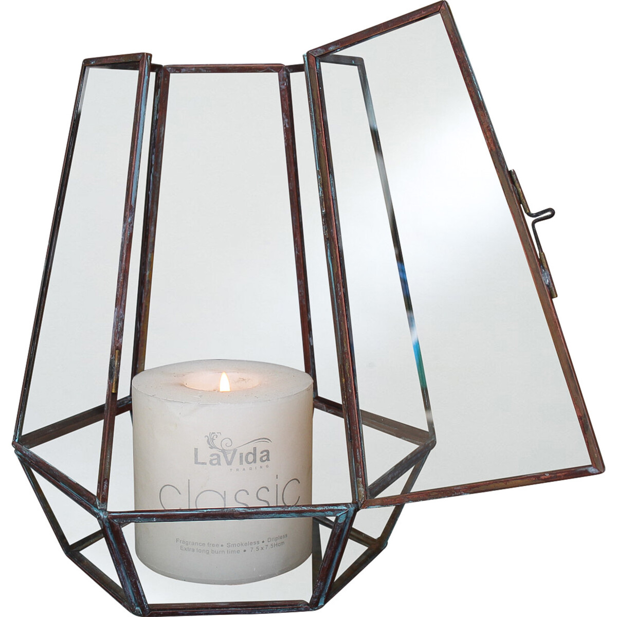 Adding lighting options of this kind in your interiors always can help you expand the scope of your décor multi-fold. Here is one votive cum lantern that has been created keeping in mind the fact that gatherings and entertaining guests can also move outdoors especially in summer days. Here is a candle receptacle that will keep it safe from the errant wind and make the entire look of the illumination seem very special too. Made from metal and glass, the faceted body of this lantern, adds a touch of vintage charm to its look. The height of the glass made body is all of 21 cm and its slightly tapering at the top body is about 16 cm in is width. The many panes on the sides allow easy filtering of the light. One of the panes opens up to allow easy placing of the candle and also easy cleaning of wax when needed.