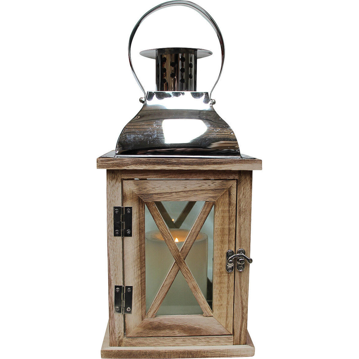 Treat yourself to an enlightened, ambient home with the classic looks of this rustic wooden lantern that has neutral tones to complement a range of interior palettes and styles for lasting style in the living area or at the dining table. Crafted from wood and glass, this piece showcases a rectangular silhouette thatés capped off with a silver metal dome hanging fixture, exuding traditional appeal in any abode. The front glass pane with a hinged door and the cylindrical metal perforated piece protruding from the top, diffuse light from any 3-6 inch pillar candle or votive (not included) creating wonderful patterns of light and shadow!