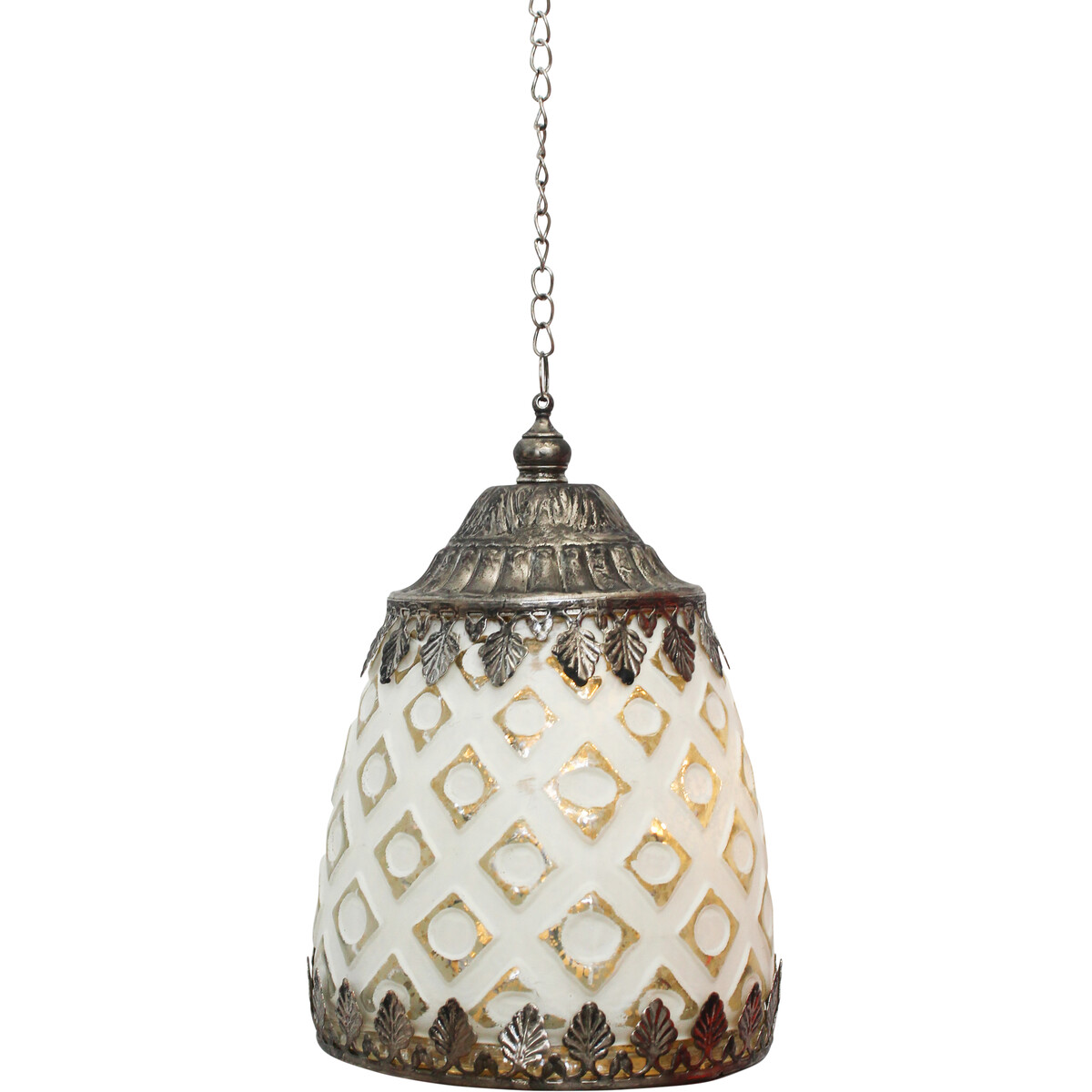 The hanging pendant shade is in soft white colour-the frame made of metal is in dull steel almost oxidized in its colour. Very antique in its looks-the metal frame on top is ornate the glass itself is opaque with a pattern embossed in gold-the tiny squares that makes up its exterior create a lovely illusion of a pattern when the light is lit. When not illuminated the delicate gold in the shade adds to its superb looks, as pretty when not lit as when it is. The lamp shade is all of 11 cm in diameter and 15 cm in height. A delicate yet sturdy metal chain helps it stay suspended with ease-the chain coordinates with the metal rim at the bottom and the main structural frame on top.