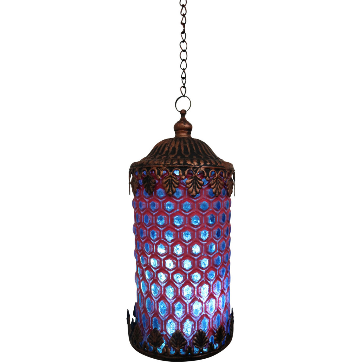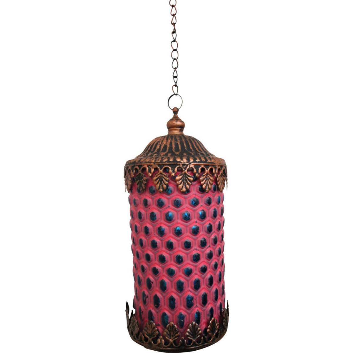 Be it the space right above the sideboard where you may have displayed some classic sculpture, or the space right above the console ort dining table -there are always those spots and spaces in your interiors that require just the right kind of light to help highlight their distinct kind of beauty and one such option are these hand crafted glass and metal made lamps. This particular piece brings together a pattern on the glass that is originally blue in colour and textured on top with a squiggle design that gives it a pink coloured exterior. The lamp is suspended from sturdy metal chain that allows is attached to the copper coloured frame right above and bowl near the rim, it is those subtle detailing in the design that makes this a form choice for modern homes, that seem to want more and more of revival of traditional chic designs in décor- and here is one that is stunning in its effect; the curved oval shaped lantern is 14 cm in height and 8.5 cm in its diameter.