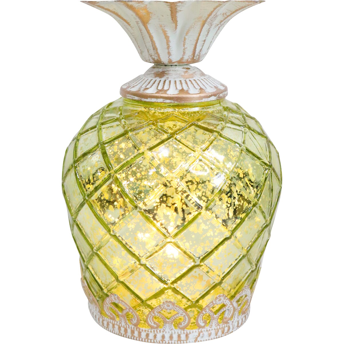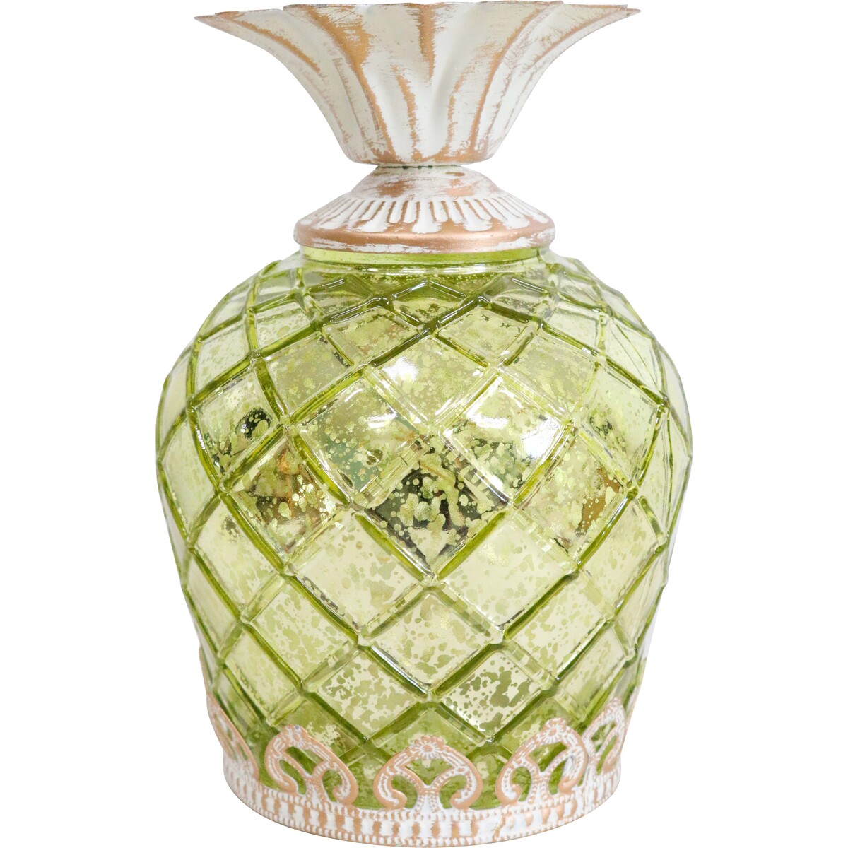 Here’s one of those pieces that has a bit of fun, vintage charm and can really brighten up the room, literally. The Lantern LED Pine Lrg Pistachio (13x13x18.5cm) is the sort of statement piece we like to have on offer in our range, because it’s got that balance of unique colour and shape, but still fits nicely into so many home or office spaces. It’s made from glass and metal, in this lovely pistachio green with that little bit of mercury shine on the inside. Something about the check pattern and flare at the top - always gets attention. The LEDs inside give this lantern a warm, golden glow through the pistachio green glass. Makes it an excellent talking point for lounges or side tables. Sometimes we suggest placing these out in front windows for homes, but they work just as well anywhere you want a pop of light and colour - especially those living spaces with plenty of neutrals. And battery operation means your customers can really move it around wherever they fancy a bit more atmosphere.