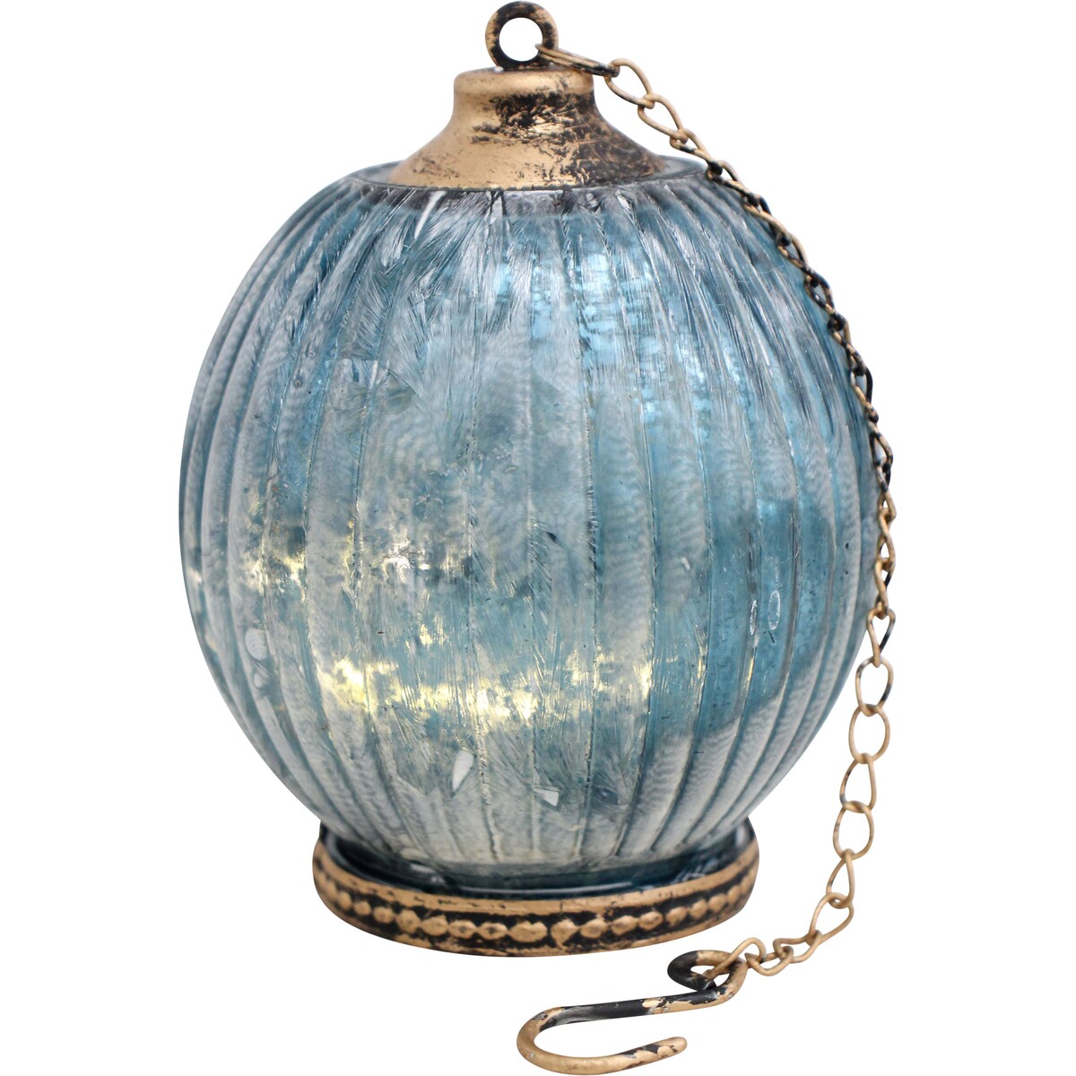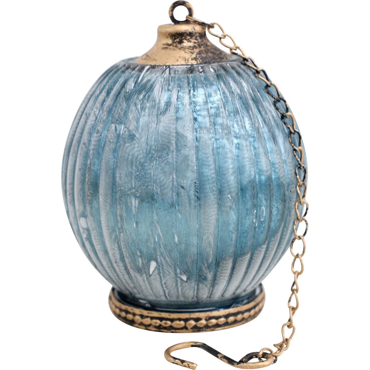 Make your spaces revel in the beauty of coloured glass lanterns that come with the advantage of LED lights. This one is shaped like a globe and has the added embellishment made of metal adding more definition to its ribbed design. The blue adds a fresh vibe to the look of the space and the soft subtle lighting makes things look decidedly more ambient. The easy to place lantern comes with its own chain attachment. The copper coloured top and base adds a glittery detail. The glaze on the blue coloured lantern adds to its sheen and beauty. The chain helps to suspend it from those spots that need more focus. Add more lanterns in varying styles at different levels for more detail in the décor.