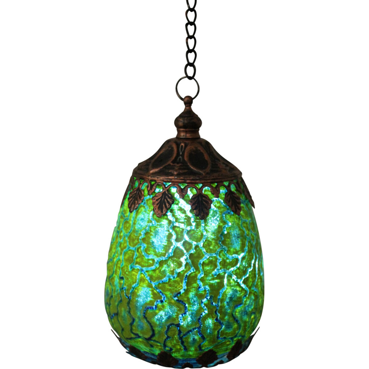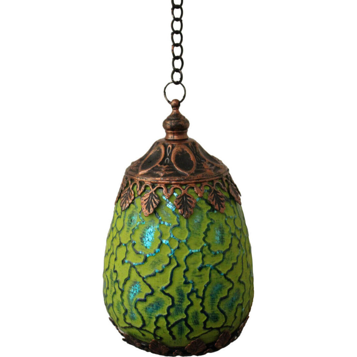 If you believe that illumination plays a critical role in giving your room and saces the touch of magic, here is an offer that is hard to let pass by. A wonderfully created mid-eastern look Moroccan lamp that can be suspended from any space and will help not just add a spot of light but also help build in a colourful glow. When lit up from within the pattern on the glass body glows generously and enhances the brightness of the space albeit I subtle and soft manner. The copper coloured upper and lower frame of the lantern helps it look all the more delightfully antique. Add it right above your dining table-perhaps in two or three or simply and them in singles from atop the console or the sideboard and give the displays in such places something of a highlight. Add the glamour of perfect lighting option and help elevate the look of your spaces to a new height of beauty and elegance. The hangable pendant light is 14 cm in height, and about 8.5 cm in diameter.