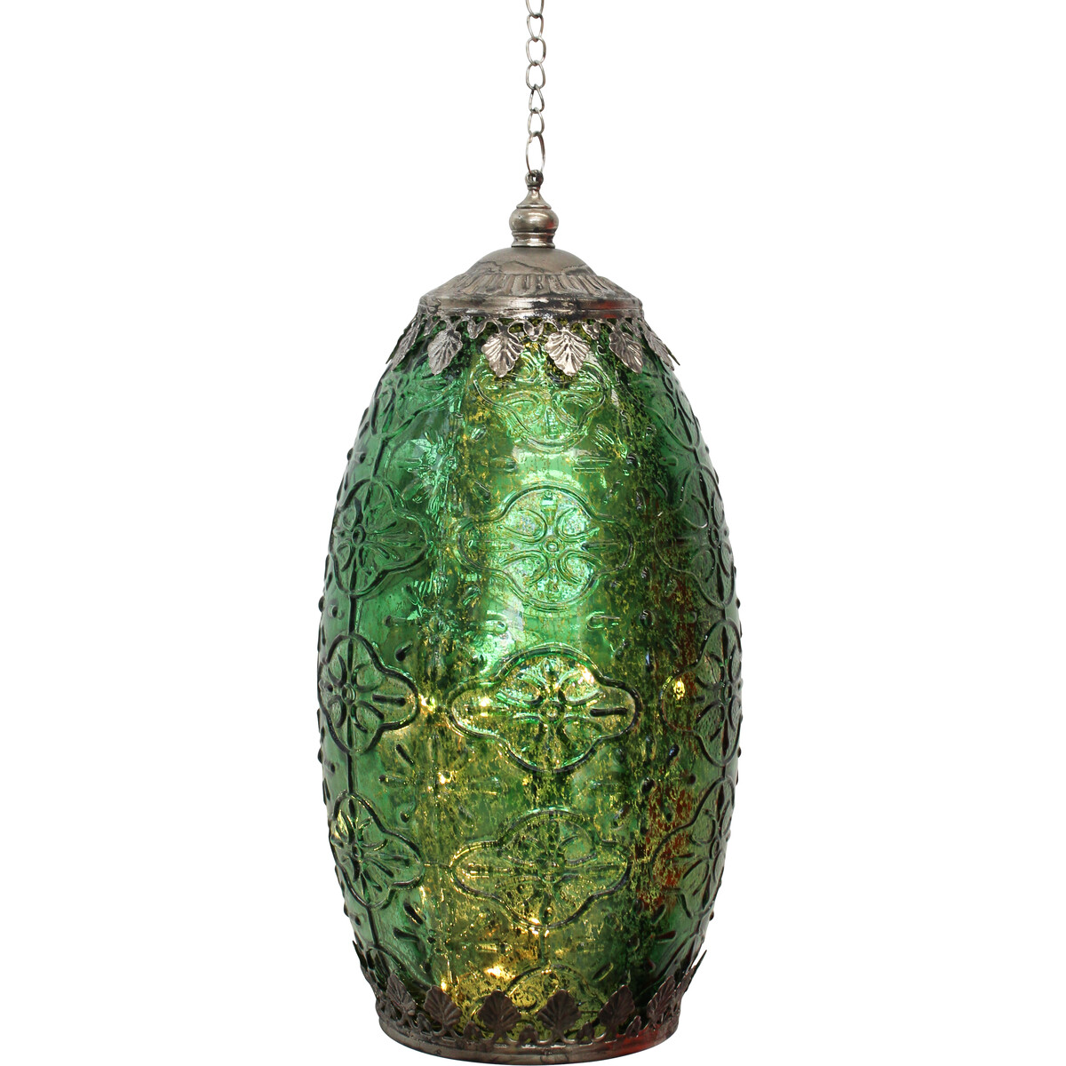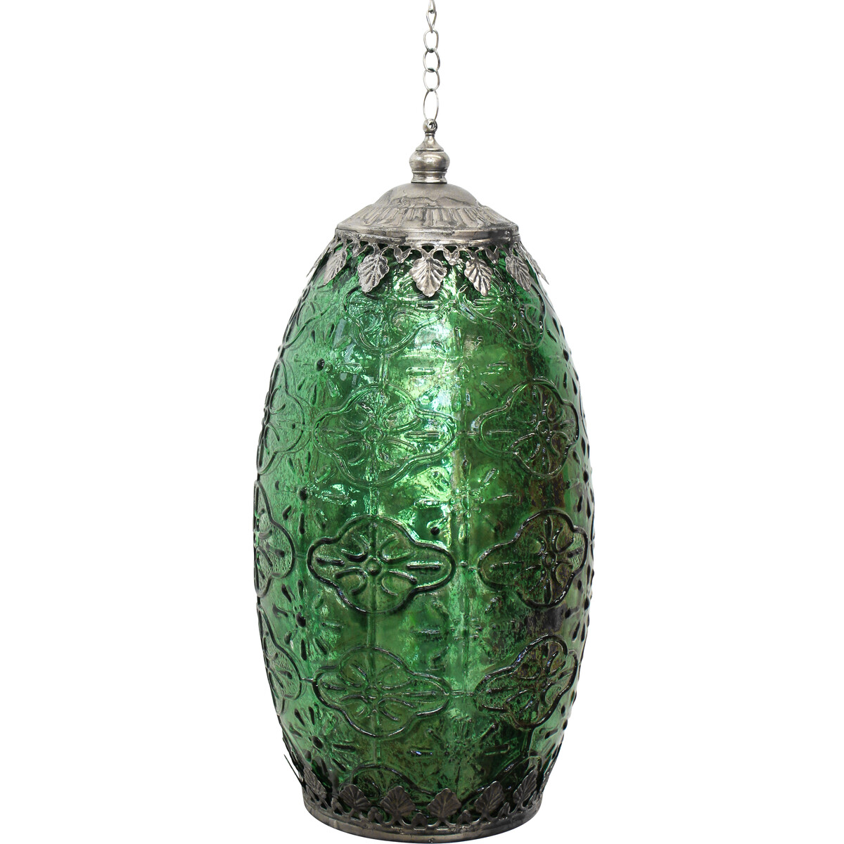 Made from fine quality glass in deep emerald green, this delightful piece on offer from Lavida combines a traditional pattern seen on the texture glass and the modernity of LED bulb. Is all of 23 cm in height with this oblong softly curving slim shape that looks resplendent when it glows in the evenings. Would look great hanging over counters and tables or above all those little spots where your d?©cor gets defined better. Comes with this hangable chain that allows it to be suspended with ease. The length stretches to 50 cm, the diameter is all of 11 cm at its broadest. The top and bottom frae in metal is in deep silvery grey that makes a vivid looking contrast with the green coloured glass-adding a better finish to the lantern. A great choice for alternate lighting option.
