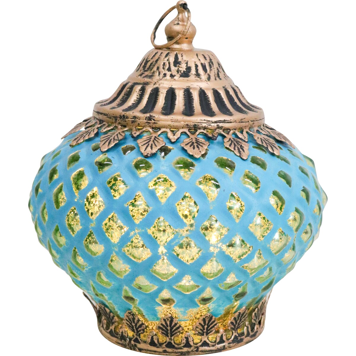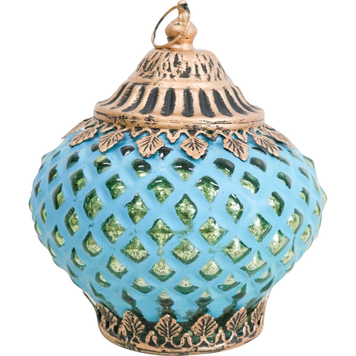 Introducing the Lantern LED Temple Blue Mojito, a stunning addition to any home or office decor. This exquisite lantern, measuring 15x15x14.5cm, effortlessly combines elegance with versatility, making it an ideal choice for retailers looking to elevate their product offerings. Crafted from high-quality glass and metal, its intricate design showcases the perfect fusion of durability and aesthetic appeal. The enchanting hue of blue, reminiscent of a refreshing mojito, is accentuated by the warm glow of LED lights, creating a serene and inviting atmosphere in any space. The Lantern's unique design is adorned with delicate leaf motifs and a charming, vintage-inspired top, ensuring it complements a range of decor styles, from contemporary to classic. Whether it's for a living room, bedroom, or office, this lantern adds a touch of sophistication and tranquility. Its compact size allows it to be used as a standalone centrepiece or as part of a larger decorative arrangement. The Lantern LED Temple Blue Mojito is bound to be a hit among consumers, blending functionality with artistry to create a must-have decor item. Retailers, embrace the opportunity to offer your customers something truly special with this distinctive lantern. Its captivating design and practical benefits make it a versatile addition that will enhance any collection and captivate shoppers.