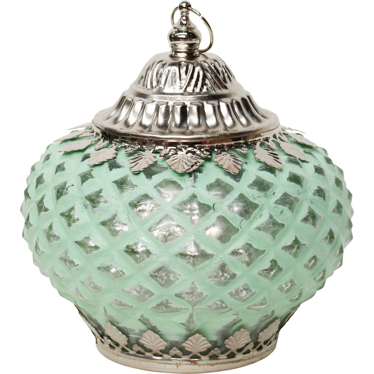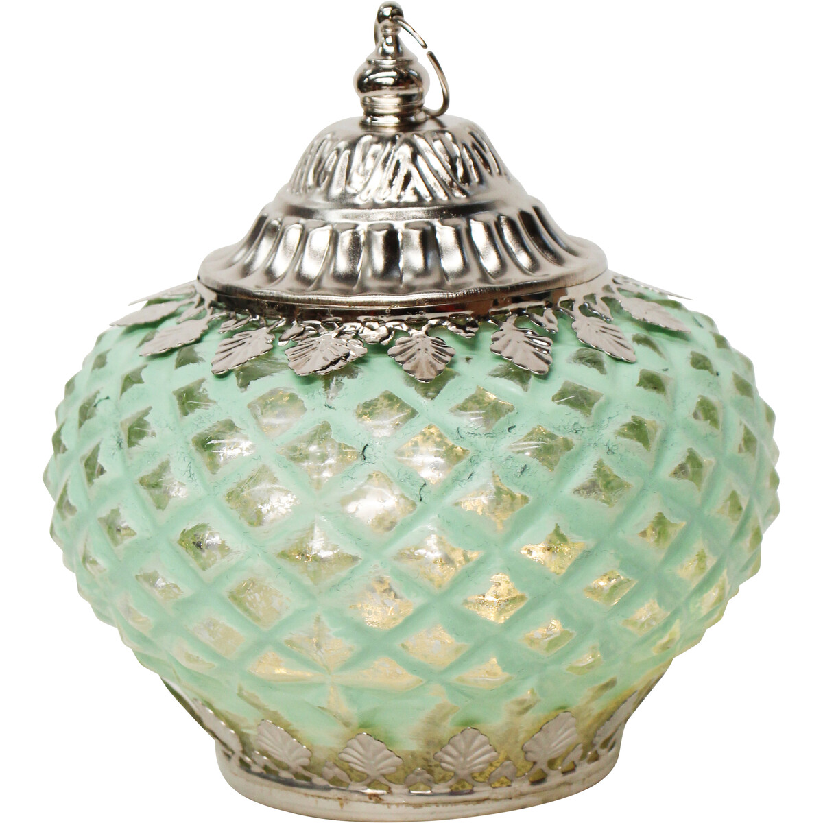 Given its aesthetically compelling decorative outlook, this Lantern LED Temple Spearmint has the capacity to set and upgrade the tone of any room where it is displayed. This is due to the combination of several factors which makes this hybridized lantern an outstanding novel piece. One of such factors is its unconventional shapely form that is nothing short of attractive. Another is the elaborate metal ornamentation which adorns the domed lid and the even base of this lantern. Another factor which makes it aesthetically compelling is its choice of mint green and silver palette.