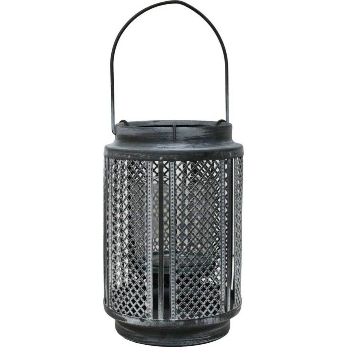 • A lattice work pattern is created in panels around the exterior of the cylindrically shaped lantern and are bordered with bead trim detail, with alternating bars and spaces between the panels letting out plenty of candle light.