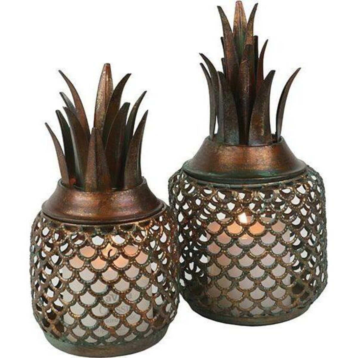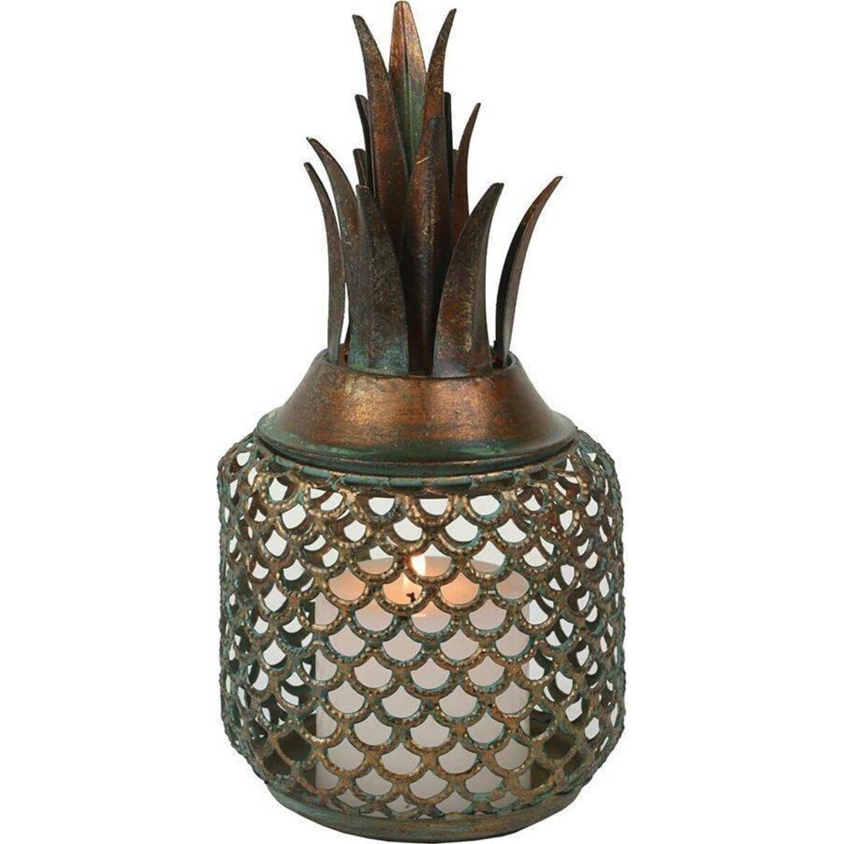 Add the energy, colour and fun of things tropical with this lovely lantern shaped like this rather enigmatic fruit known as much for its taste as for its rather unique shape. A warm weather fruit that has luscious juicy taste is also the reason why most décor love to host it in some form or the other. The lantern pineapple will add that look of antique charm while at the same time make the area light up with an interesting form of shadow created with the light filtering through the scallops that embellished the body of the lantern. It is in its interesting shape that this very pretty piece gets its most charming feature. The lantern is all of 28 cm high with a diameter of 15 cm and can hold a medium sized pillar candle within. The candle could be placed by lifting the plumed top that has some gorgeously crafted metallic leaves in a pretty copper colour. Create drama that your spaces could do with and pace this lantern on table tops, corners and such places and make all the difference to the ay your home could look.